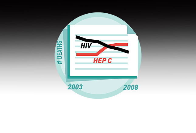 尽管新的丙型肝炎感染数下滑,2007年丙型肝炎死亡数从1999年的3/100,000增加到几乎5/100,000。艾滋病死亡人数从1999年的超过6/100,000下降到2007年的4/100,000。值得注意的是,丙型肝炎病毒的传染性比艾滋病病毒高了10倍以上。 2010年:第一次快速检测成为现实