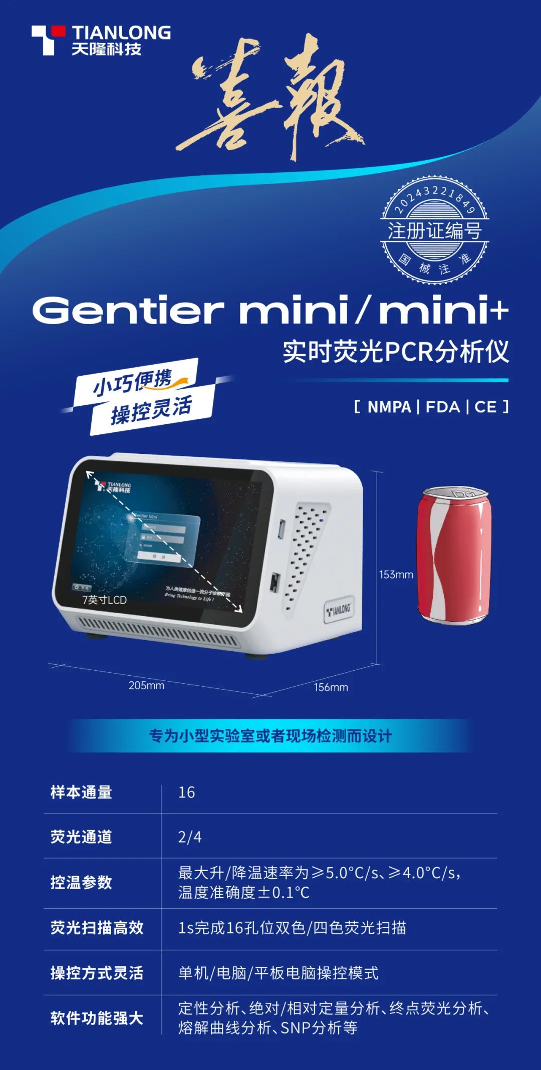 Gentier mini/mini+ 实时荧光PCR分析仪是天隆科技专为小型实验室、移动实验室或现场检测而设计。该款产品小巧便携,操控灵活,并且温控卓越,检测高效,已取得国内NMPA、美国FDA及欧盟CE等权威注册及认证。能满足医疗机构、疾控中心、养殖场、宠物医院、海关、科研院所等用户的现场检测或快速检测需求。