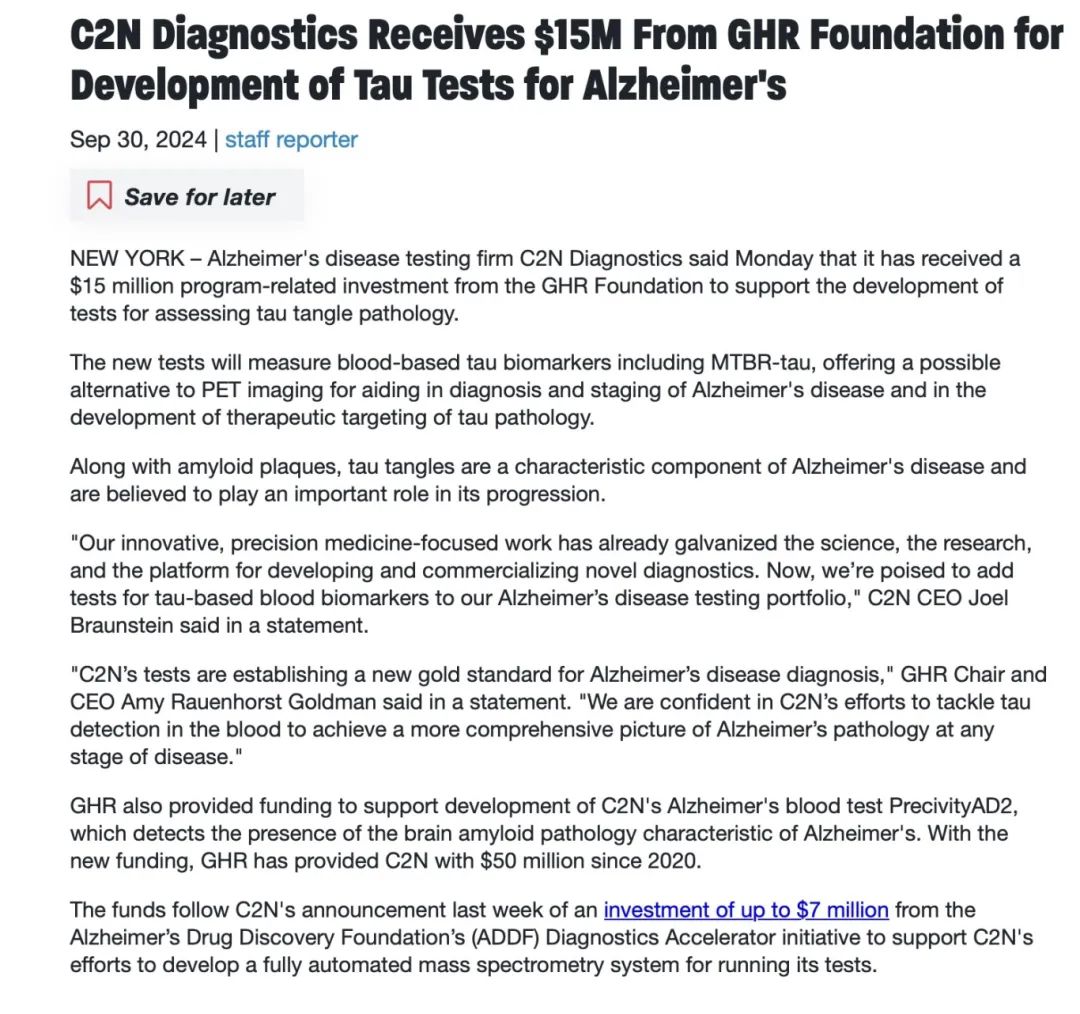 阿尔茨海默病测试公司C2N Diagnostics 9月30日表示,从GHR基金会获得了1500万美元的项目相关投资,开发评估tau纠结病理的测试。 新测试将测量基于血液的包括MTBR-tau在内的tau生物标志物,为PET成像检测提供可能的替代品,可以帮助阿尔茨海默病的诊断和分期,以及tau病理的靶向治疗的开发。 与淀粉样斑块一起,tau tangles是阿尔茨海默病的一个特征组成部分,被认为在AD进展中起着重要作用。 “我们以精准医学为重点的创新工作已经激发了开发和商业化新型诊断的科学、研究和平台化。” C2N首席执行官Joel Braunstein在一份声明中表示:“现在,我们准备将基于tau的血液生物标志物测试添加到我们的阿尔茨海默病测试组合中。” GHR主席兼首席执行官Amy Rauenhorst Goldman表示,C2N的测试正在为阿尔茨海默病诊断建立新的金标准。“我们相信C2N在努力解决的血液tau检测,可以更全面地帮助我们了解阿尔茨海默氏症在任何疾病阶段的病理。” GHR还提供资金支持C2N阿尔茨海默氏症血液测试PrecivityAD2的开发,该测试可检测阿尔茨海默氏症脑淀粉样病理特征。GHR自2020年以来为C2N提供了5000万美元。 此前,C2N宣布从阿尔茨海默氏症药物发现基金会(ADDF)诊断加速器计划中投资高达700万美元,以支持C2N开发一个全自动质谱系统来运行其测试。 |