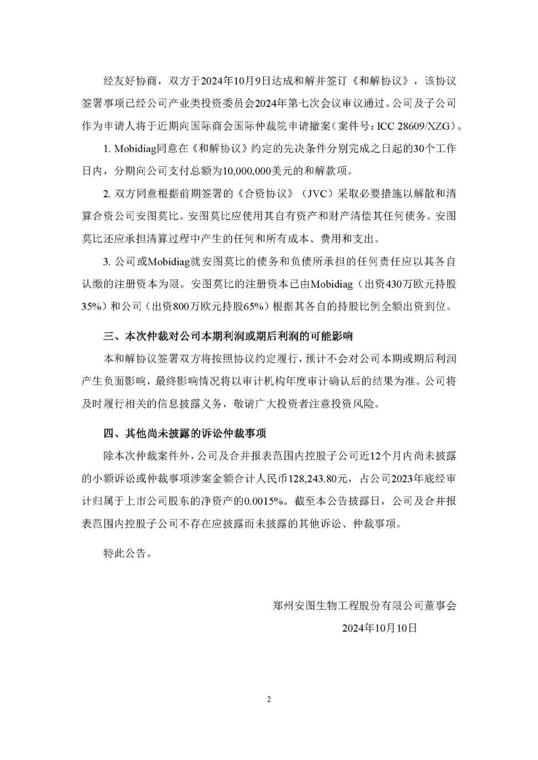 整理自安图生物 安图生物10月10日公告,公司及子公司安图莫比、安图仪器与被申请人Mobidiag Oy 就双方之间的《合资协议》(JVC)、《许可、开发和分销 具体为: 1、Mobidiag同意在《和解协议》约定的先决条件分别完成之日起的30个工作日内,分期向公司支付总额为10,000,000美元(约7000万元人民币)的和解款项。 2. 双方同意根据前期签署的《合资协议》(JVC)采取必要措施以解散和清算合资公司安图莫比。安图莫比应使用其自有资产和财产清偿其任何债务。安图莫比还应承担清算过程中产生的任何和所有成本、费用和支出。 3. 公司或Mobidiag就安图莫比的债务和负债所承担的任何责任应以其各自认缴的注册资本为限。安图莫比的注册资本已由Mobidiag(出资430万欧元持股35%)和公司(出资800万欧元持股65%)根据其各自的持股比例全额出资到位。 2018年12月15日,安图生物与Mobidiag Oy签署投资《合资合同》 2019年5月17日Mobidiag与安图莫比签署《许可、开发和分销协议》(LDDA), 2021年2月9日, 2021年11月10日,Mobidiag以电子邮件形式发出单方终止上述协议的通知。终止的理由为:安图莫比在未获得Mobidiag的事先同意的情况下进行了引物技术研发并申请专利;向安图生物披露了Mobidiag的涉密技术信息,违反了与其签署的LDDA的约定。 公司不认可上述Mobidiag终止行为的效力及终止理由。后经各方沟通无果, |