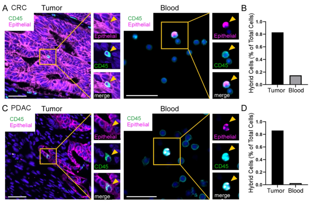 基于Ab-oligo的cyCIF依赖于在每次抗体染色后,依赖UV光从抗体上切割荧光探针,从而产生最小的细胞损失和细胞损伤。此外,基于Ab-oligo的cyCIF平台类似于质谱多路工作流程,因为所有Ab-oligo都是在一个步骤中孵育到组织上,减少了总体实验时间。 全球癌症死亡率持续居高不下,凸显了影响生存的疾病监测和检测方面尚未解决的挑战。开发一种非侵入性的、基于血液的生物标志物将改变癌症患者的生存状况。本文中作者证明了超高含量分析对新鉴定的肿瘤细胞群的功能,这些肿瘤细胞是肿瘤细胞和免疫细胞在患者匹配的肿瘤和外周血标本中的杂交细胞。作者使用允许循环免疫荧光(cyCIF)的寡核苷酸偶联抗体(Ab-oligo),提出了肿瘤和外周血杂交细胞的表型分析。有趣的是,大多数循环杂交细胞(CHC)亚群并未在肿瘤相关的杂交细胞中鉴定出来。这些结果强调了将基于Ab-oligo的cyCIF用于肿瘤和外周血标本的超高含量表型分析的有效性。多重表型分析平台(足够温和,可分析血液,以检测和评估播散的肿瘤细胞)的组合代表了一种探索新型肿瘤生物学的新方法,以及将人群开发为癌症的血液生物标志物的潜在效用。 为了确定肿瘤相关杂交细胞和循环杂交细胞之间是否存在一致的表型,作者首先在患者匹配的肿瘤组织切片和肿瘤切除时采集的外周血样本中确定了深度表型的杂交细胞。作者利用cyCIF进行了多轮抗原染色和成像,并在轮间温和地去除信号,证明这些信号与外周血分析兼容。为了建立混合细胞表型Ab-oligo组合,作者从5个离散类别中选择了抗原:肿瘤表达、免疫细胞、基质、细胞信号传导和功能,以便分析相对于离散肿瘤标志(基质、免疫)的混合细胞特征(即增殖、细胞信号传导状态、表型/功能)。生成相应的Ab-oligo后,作者证明,与常规间接抗体染色(即使用结合荧光团的一抗-二抗)和常规二抗染色检测到的Ab-oligo偶联物相比,每种Ab-oligo (即Ab-oligo+IS)在肿瘤组织中具有一致的染色模式(下图A)。 图注:来自五个表型类别:肿瘤、免疫、基质、细胞信号和功能的代表性生物标志物的Ab-oligo验证 此外,作者评估了Ab-oligo + IS与单纯IS处理的组织以及Ab-oligo + IS染色组织经紫外线处理后的信号背景比。在所有病例中,特异性Ab-oligo信号与背景的比值均大于对照组(即大于1)(上图C)。接下来,作者在一个外周血-人癌细胞系模型上验证了Ab-oligo染色模式,该模型将Ab-oligo添加到从健康受试者分离的外周血单个核细胞(PBMCs)中,以评估抗体对肿瘤或免疫细胞的特异性。与肿瘤组织染色的结果一致,相对于间接抗体染色和Ab-oligo +二抗,Ab-oligo显示出相同的染色模式(上图B)。此外,除VWF不能染色外,所有Ab-oligo + IS组的信号/背景比均大于对照组(即大于1)。 为了在患者匹配的肿瘤和外周血中鉴定杂交细胞,作者将针对CD45(一种泛白细胞标志物)的一小组Ab-oligos,以及含有针对EpCAM、ECAD和泛细胞角蛋白(panCK)的Ab-oligos应用于CRC和PDAC肿瘤组织以及匹配的分离的PBMCs。利用这一组合,作者在CRC和PDAC样本的原发肿瘤和外周血中发现了大量杂交细胞(如下图)。 图注:肿瘤组织和外周血杂交细胞鉴定 接下来,作者在另外三轮染色中对患者匹配的样本应用了经过验证的Ab-oligo组合,以从杂交细胞获得更多的表型信息。在第一轮中,杂交细胞被鉴定出同时表达CD45和至少一种上皮标志物(ECAD、EpCAM和/或panCK)(如下图,第一轮)。在每一轮Ab-oligo染色之间,作者用紫外线处理标本,并重新扫描组织,以确保在进行下一轮染色之前完全清除荧光信号。另外,免疫组织化学染色包括:第2轮(CK19、Ki67、pAKT、CD44);第3轮(CK8、VIM、EGFR);第4轮(CK7、αSMA、VWF)。为了将所有的染色叠加到一张图像中,作者使用QiTissue(一个多重图像可视化和分析软件包)或基于特征的图像配准。这使得作者能够在肿瘤组织和相应的外周血标本中鉴定杂交细胞并对其进行表型分析(如下图)。 图注:在患者匹配的结直肠癌(CRC)和胰腺癌(PDAC)肿瘤切片和血液标本上进行四轮cyCIF鉴定和表型杂交细胞 参考文献: Whalen RM, Anderson AN, Jones JA, Sims Z, Chang YH, Nederlof MA, Wong MH, Gibbs SL. Ultra high content analyses of circulating and tumor associated hybrid cells reveal phenotypic heterogeneity. Sci Rep. 2024 Mar 28;14(1):7350. doi: 10.1038/s41598-024-57381-8. PMID: 38538742; PMCID: PMC10973471. 杭州乐为生医公司 杭州乐为生医公司可提供抗体寡核苷酸偶联技术服务及成品试剂盒。助力您在实验室条件下即可轻松实现Ab-oligo的高效偶联。 技术支持联系电话:18611591243 销售联系方式:19957893538 |