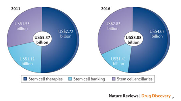 干细胞产业仍处在萌芽阶段,但越来越多的实验证实,干细胞在药物研究不仅能够攻克很多疾病,同时也会产生巨大的利润。根据美通社报道称,2020年全球干细胞治疗市场可达到2020亿美元。2013年是干细胞研究公司IPO年,很多公司在这一年进行了IPO。去年,英国第二大生物制药公司阿斯利康(Astrazeneca)就与Cellular Dynamics公司达成合作关系,加强利用iPSC细胞在药物发现上的应用。阿斯利康一直是创新药物的领导者,其曾经就购买了Cellular Dynamics公司利用iPSC生产的人类心肌、血管、神经细胞以及肝细胞。从而从这些细胞中找到刺激非多能干细胞转变为其他细胞的分子。因为在人类目前难以攻克的疾病中,如果是组织能够自我修复这将会产生巨大的利润。事实上,英国最大的生物制药公司葛兰素史克同样盯上这项研究。 今年4月14日,来自苏格兰国家血液服务中心医疗总监特纳(Marc Turner)花费数年时间,利用ips细胞培养出血红细胞。血红细胞的培养时间也只需1个月左右,未来人工血液很有可能会取得现在的人体献血模式“这是人类首次製造出适合用于人体的血红细胞,史无前例。”目前,根据卫生部相关数据显示,我国每年的血液需求量达到8000吨,而2010年统计时,我国采浆量为4180吨,仅相当于需求量的50%,所以人工血液在国内外将有很大的市场,而且对于那些稀缺性血液来说,其潜在的应用价值更是不言而喻了。 美国政府资金对干细胞研究的资助以及FDA对干细胞疗法的批准,使得北美仍是干细胞产业的中心,同样在太平洋的彼岸,东南亚地区将是干细胞产业增长 最快的地区,这一地区密集的人口所带来的强大市场、以及政府制定的有力政策将的是干细胞在这一地区很有市场。目前,这方面的公司有Mesoblast公司(澳大利亚),Aastrom生物科学公司(美国),Celgene公司(美国),和Stem Cells,Inc.(美国)。 目前全球从事干细胞产业的公司多达300余家,但是在巨大的利益诱惑下,很多生物公司并不对病人安全负责。中国的干细胞市场,同样比较混乱,《自然》以及《经济学人》等知名杂志对中国混乱的干细胞市场进行严厉地批评。很多公司在利益的驱使下,铤而走险,很多治疗手段并没有被国家卫生相关部门得到审批而对病人进行治疗。况且有些公司打着干细胞库,储存干细胞的名义,向病人索要高昂的费用。 干细胞治疗既是人类攻克疾病的一个契机,又是人类面临的一个考验。