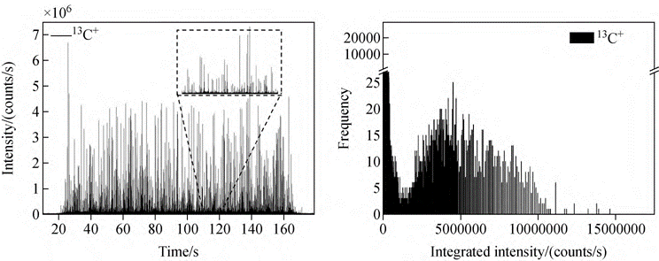 图4 采用sp-ICP-MS通过13C+ 获得2.5μm 聚苯乙烯微球的瞬态信号(a)和强度分布(b)
