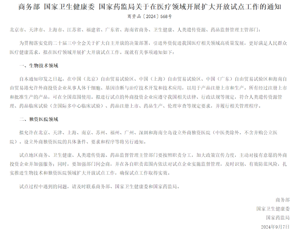 早在今年9月7日,商务部、国家卫健委、国家药监局发布了《关于在医疗领域开展扩大开放试点工作的通知》,明确了在中国(北京)自由贸易试验区、中国(上海)自由贸易试验区、中国(广东)自由贸易试验区和海南自由贸易港允许外商投资企业从事人体干细胞、基因诊断与治疗技术开发和技术应用,以用于产品注册上市和生产。