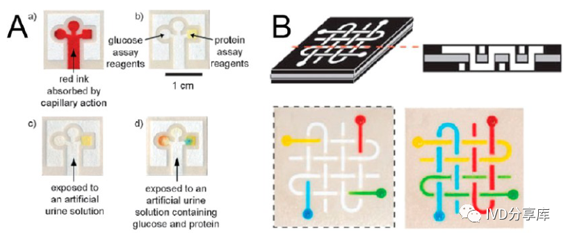 纸基微流控芯片(A)纸芯片上的生物测定;(B) 多层通道制造。