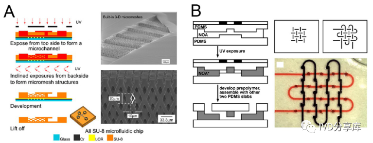 (A)微通道完全由SU-8制成,具有原位制造的3D精细结构;(B)热固性NOA制备三维微流控通道。