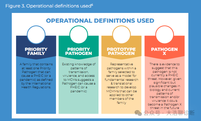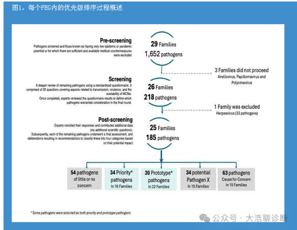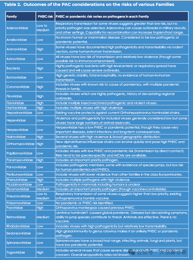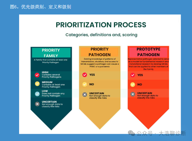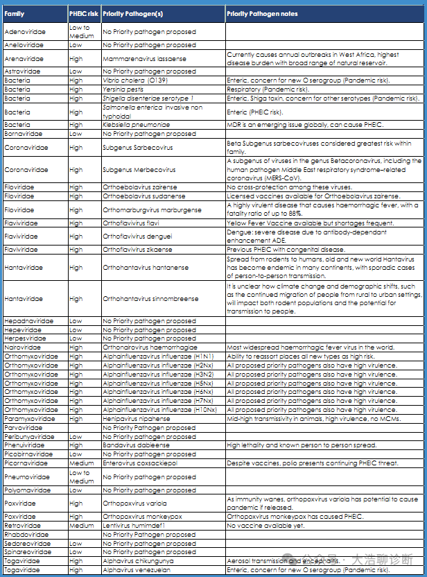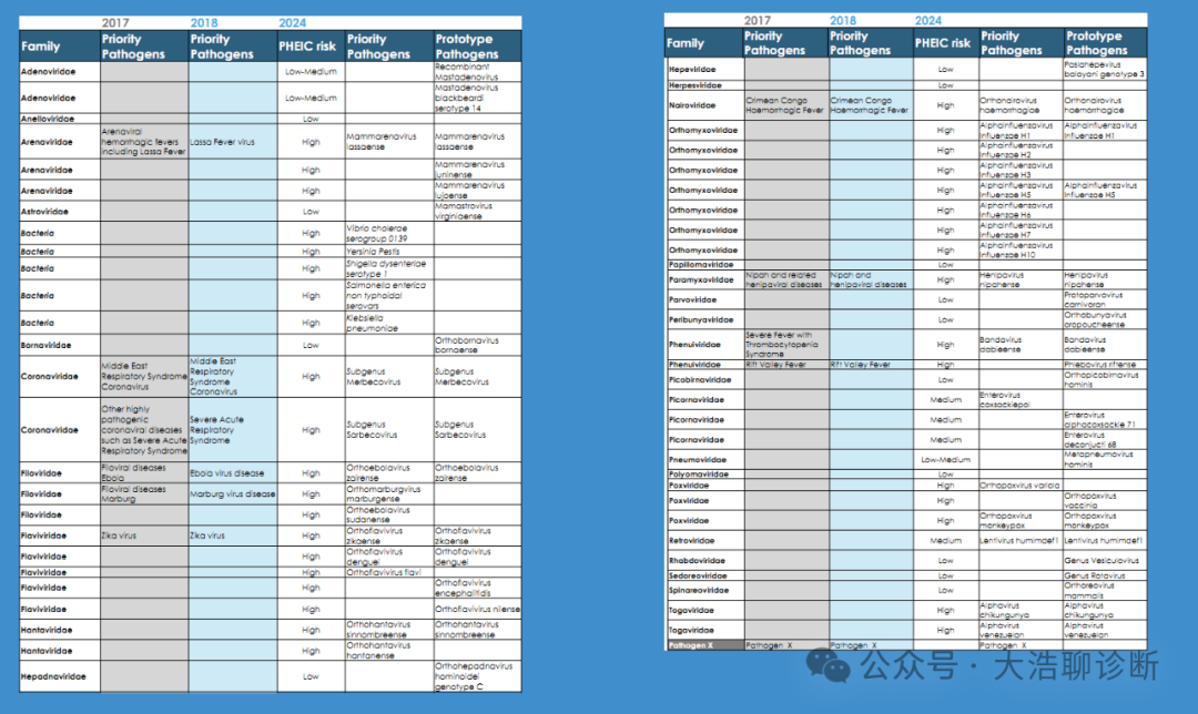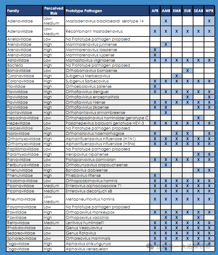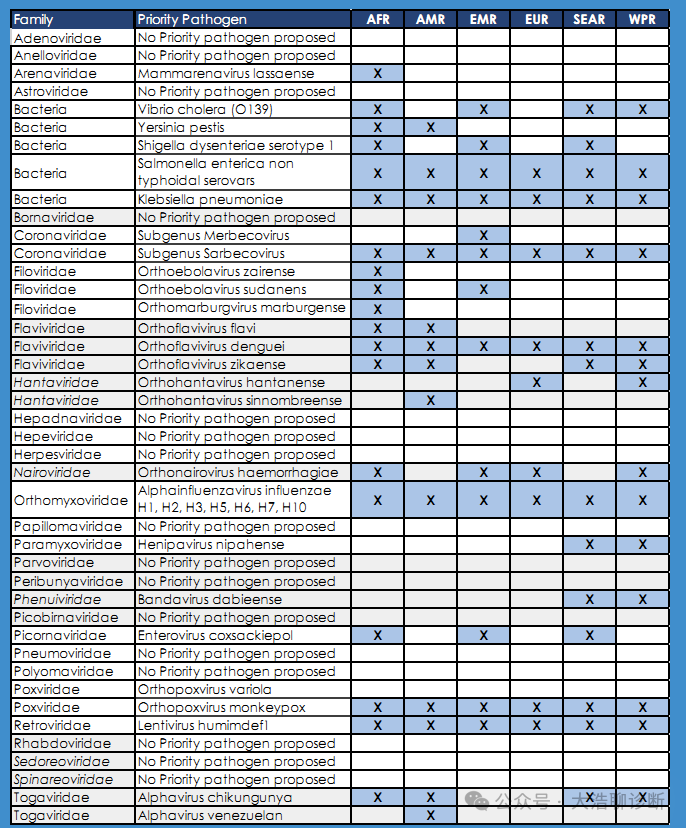 前 言 世界卫生组织于2024年7月30日更新发布,病原体优先排序:流行病和大流行研究准备的科学框架的文章《Pathogens prioritization: a scientific framework for epidemic and pandemic research preparedness》。 文章研究涉及来自50多个国家的200多名科学家,这些科学家评估了与28个病毒家族和一个核心细菌组相关的证据,其中包括1652种病原体。 问题与反思: 病原体优先排序:未来需要关注的病原体 文章首先介绍了2017、2018与2024年优先考虑病原体的更新情况。 其次是每个专家小组对于病原体优先级的排列过程的概述。第一次会议上,专家们审查了病原体家族中的最初病原体清单,并剔除那些被认为(根据目前的知识)仅有非常低可能引发大流行或者是无法引起流行病或大流行的病原体。第二次专家裁决,需要全面的评估,以确定每种病原体是否值得纳入以下两类之一。第一类:如果有大量证据表明其有高传播性和毒力,如果不加以控制,能够引发国际公共卫生紧急事件(PHEIC)或大流行。第二类:虽然现有证据不足以支持成为第一类,但足以引起关注并可能符合病原体X的资格的病原体。 第三,每个专家小组的参与者都完成了对每种剩余病原体的筛查后调查,其中包括补充询问和扩展的评估部分。参与者都被要求提供每种病原体的风险评估,同时考虑到引发国际公共卫生紧急事件(PHEIC)或大流行的可能性,具体如下评估其传播能力、毒力和可用性对策。 评估后采用从1到5的评级(表示风险非常低到非常高)或“数据不足”来做出判断。随后,专家小组的成员列出如下类别的病原体,以下是提供的其分类及定义。 1.优先病原体家族:根据世卫条例的规定,在病原体家族中至少含有一种会引起国际公共卫生紧急事件(PHEIC)或流行病的病原体。2.优先病原体:通过分析其传播模式、毒力、可用性对策即现有知识表明,病原体可能导至国际公共卫生紧急事件或者大流行出现。3.原型病原体:每个病原体家族中具有代表性的病原体会被选为基础研究和转化研究的模型,通过对其研究可以开发应用于该家族其他病原体的可用性对策。4.病原体X:病原体并不足以是国际公共卫生紧急事件的威胁,但是鉴于其生物学和当前传播力和毒力的变化,其在未来可能成为病原体X。 那么上述的分类是如何来的?可以参考下图,其为进行分类时所采用的标准与级别。 病原体家族会分为:高风险(病原体家族中多个确定的优先病原体)、中风险(病原体家族中至少有一个优先病原体)、低风险(病原体家族中不确认有优先病原体)以及不确定风险(没有足够数据)。优先病原体:根据现有知识、传播模式、毒力和可用性对策判定上述是有或无亦或未确认进行分类。原型病原体:其为在病原体家族中是否有还是不确认有,代表性的病原体可以被选择出来作为基础研究和传播模式研究以及发展可用性对策的病原体。 总体而言,专家组审查来自8个DNA病毒家族、19个RNA病毒家族和5个细菌家族的证据。根据其携带能够引起国际公共卫生紧急事件或流行病的优先病原体的能力进行分类。 接着根据定义为不同病原体家族分类以及其引起国际公共卫生紧急事件的风险评估,最后还包括对于这一病原体家族的说明。 后续对流行和大流行研究的科学框架进行描述。首先对病原体家族进行研究,挑选出优先病原体和原型病原体,进行发病机理、免疫学、诊断试剂、病原生物学等研究,再将其可用性对策(如疫苗和单克隆抗体)进行临床测试。 因此根据上述的分级,最终出具病原体家族及优先病原体,并且根据地区分布进行了标记。并附上引起国际公共卫生紧急事件的风险的等级评估和优先病原体注意事项。 对原型病原体也按地域进行更新和风险评估并进行记录。 此外,在所有六个地区都存在属于低风险病毒家族的几种原型病原体,例如,人型偏肺病毒和轮状病毒。 如上图所示在全球不同的区域,优先事项可能会有所不同,因为许多病原体仅限于特定地理区域,或是多个特定地理区域。为了促进每个地区的研究,有针对性的研究当地相关的原型病原体就显得尤为重要。例如对于许多病原体家族来说,单一的原型病原体被认为足以覆盖整个病原体家族。 然而对于另一些病原体家族而言,如果潜在的原型病原体被限制在某些地区或由不同的媒介传播,则有必要选择多种原型病原体进行研究。 非洲地区 非洲地区的特别优先病原体:包括丝状病毒(扎伊尔型埃博拉病毒、苏丹型埃博拉病毒和马尔堡病毒)、猴痘病毒、正痘病毒和拉沙热病毒。 其他包括所有三种优先的病原体(登革病毒、乙型脑炎病毒和寨卡病毒)和基孔肯雅病毒。在全球病原体中,Lentivirus humimdef1具有特别重要的意义。 另外细菌优先病原体在该地区也很重要包括,霍乱弧菌O139、鼠疫耶尔森菌、痢疾志贺菌血清型1、非伤寒沙门氏菌(侵袭性)、肺炎克雷伯氏菌。而拉沙热病毒和裂谷热病毒,则是非洲地区特有的原型病原体。 美洲地区 美洲地区特有的特别优先病原体:汉坦病毒和委内瑞拉马脑炎病毒。所有三种优先的病原体(登革病毒、乙型脑炎病毒和寨卡病毒)都是该地区的常见的流行病。 美洲地区特有的原型病原体:Mammarenavirus juninense、 Orthobunyavirus oropoucheense.这两种病毒(实在是找不到中文翻译,有的话大家可以提供给大浩) 中东地区 中东地区的特别优先病原体为:梅尔贝科亚属病毒(Subgenusme