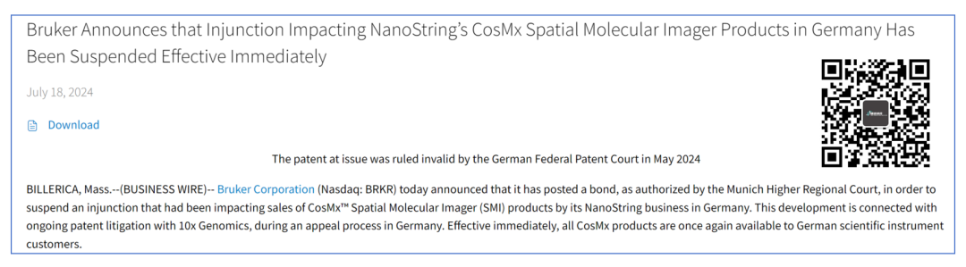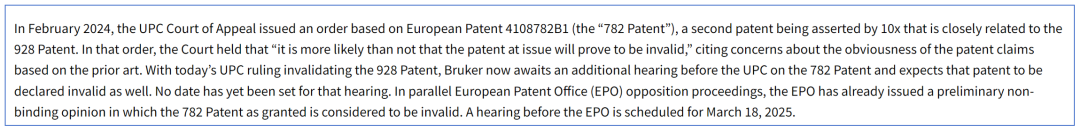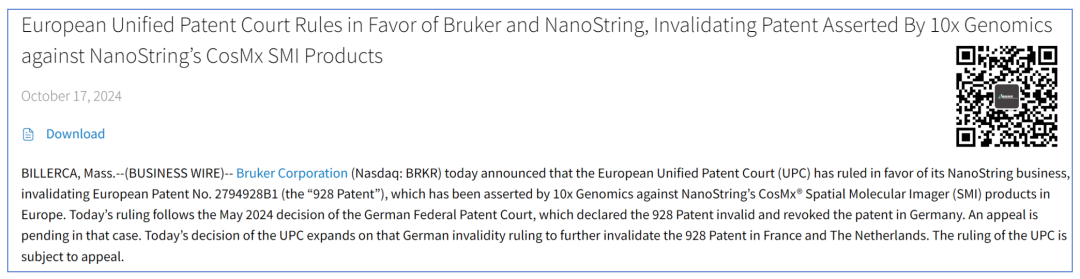 我们先聊一篇旧闻,热热身。 2024年10月17日,Bruker宣布公司赢得了欧洲联合专利法院(UPC)的有利判决。 声明中称UPC认定10x Genomics所声称的NanoString侵犯的其欧洲专利2794928B1(928专利)无效。 呃,比较拗口,但是我们大家都能懂: 10x Genomics在欧洲又输了。 根据公告,本次裁决也是依据今年5月份德国联邦法院的无效决定,只不过本次裁决将在法国和荷兰生效。 当然,10x Genomics不可能满意这个结果,上诉是肯定的了。 而这已经是10x Genomics在欧洲战场吃到的第n个瘪了... 2024年7月18日,Bruker(布鲁克)发布公告,旗下NanoString 空间生物学产品CosMx在德国的销售禁令已经解除。 2024年2月26日,欧洲专利法院UPC( European Unified Patent )推翻了此前针对NanoString CosMx产品的禁售令! NanoString CosMx产品立即恢复在欧洲16国的销售。 UPC认为,10x Genomics此前宣称NanoString侵犯其欧洲专利4108782B1(782专利)有效性存疑,很有可能无法证明其法律上的有效性。 目前,也就剩下这个782专利硕果仅存了。 UPC针对782专利的听证会目前还没有时间安排,但是根据Bruker的说法,782专利很有可能被正式宣布无效。 而在欧洲专利局(EPO)平行进行的程序中,其已经发表了一个非约束的意见认为782专利是无效的。 这说明将要在2025年3月18日举行的EPO听证会,对10x Genomics来说也是极其不利的。 今年对10x Genomics来说可谓是流年不利,截至目前股价今年已经跌去了七成多。 不说别的,隔壁Illumina还涨了4个点... 雪上加霜的是,10x Genomics的Q3业绩已经基本确认不及预期了。 这次,估计笑的最开心的一定是Bruker。 “嘿嘿,谁说老子买了个赔钱货,你看,这就是咱的眼光。” 至于10x Genomics,这个单细胞测序和空间生物学领域的标杆企业将会走向何方,我们拭目以待。 “一分钱一个细胞”的战略能否让10x Genomics逆风翻盘,我们也讲持续关注。