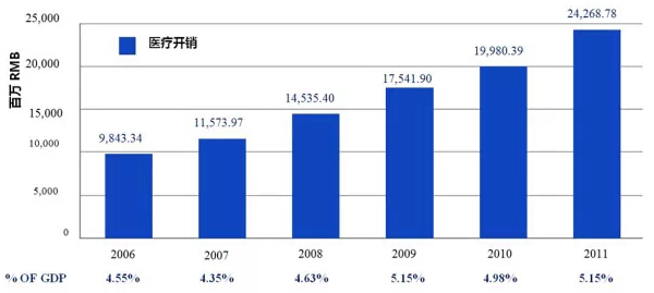 如果以移动设备的数量来计算,这一数字将更加惊人,因为许多人不止有一部移动电话、手机或者平板电脑。根据思科视觉网络指数预测,全球移动通信数据流量在2012至2017年之间将会增长超过十倍分析人士同样预测中国和美国的移动通信数据流量会有大幅度增长。 移动网络对于全球经济起到了巨大作用,对于消费的增长贡献尤其明显,其远超预期的发展成果使得产业效益得以提升。根据OECD从1998到2010年以来针对发达国家的数据显示,网络普及率每提高10%将带动0.035%的经济增长。 在中国城镇中,移动网络的影响甚至高于普通网络。中国互联网络信息中心(CNNIC)在2013年6月所做的研究来看,中国乡镇78.9%的网络用户都依靠移动手机访问网络,这远远高于使用台式电脑(58.8%)和笔记本电脑(32.4%)访问网络的比例。就2013年6月而言,中国27.9%的网络用户(1.65亿人)生活在乡镇。这些数据也预示着,对于通过网络来提供广泛的服务而言,仍然存在巨大的机遇。 二、中国和美国面临的医疗环境 (1)医疗成本持续升高 无论是在中国还是美国,医疗费用都飞速增长。中国2011年的医疗费用占了GDP的5.15%。中国在2006年到2011年之间每年的医疗开销,该项支出从2006年的0.98万亿人民币(折合0.16万亿美元)增长到2011年的2.4万亿人民币(折合0.396万亿美元)(见图2)。 图2:中国年均医疗开销,2006-2011