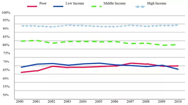 美国的医疗支出占家庭收入的比例预计也将日益增加。美国学者预测,到2037年,平均医疗支出将超过家庭收入的中位数。 (4)医疗服务差异明显 美国医疗保险贫富差距明显。相比于中产阶级或者富人,低收入美国人接受医疗服务的机会普遍少于前者。95%左右的高收入美国人购买了医疗保险,而低收入人群则只有70%(见图6)。 图6:美国不同收入水平人群医疗保险比例的差异,2006-2010