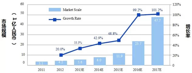 在iiMedia调查报告中,中国移动医疗应用市场正在迅速增长,他们估计中国移动医疗市场规模是18.6亿人民币,比去年增长17.7%。他们还预测中国移动医疗市场在2017年底将超过100亿人民币。 (1)国内可穿戴设备和远程监控 iiMedia同时还预见到中国的可穿戴式医疗器械市场的快速增长。数据显示,2012年可穿戴式医疗设备市场在中国将达到4.2亿人民币,到2017年将超过50亿人民币(见图9)。远程监控设备快速发展的移动医疗产业的一部分。据报道,中国医疗监控服务市场规模在2017年将达到12亿美元,有超过90%的收入将来自于慢性疾病的解决方案。 图9. 中国的可穿戴移动医疗设备的市场规模