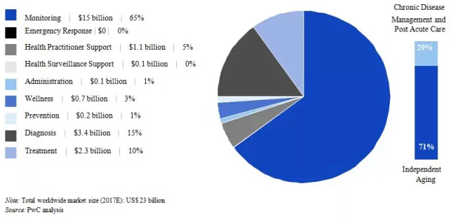 监控服务将主导全球移动医疗市场。到2017年,检测服务将达到150亿美元(见图10)。 图10. 2017年通过业务分类的全球移动医疗市场机遇
