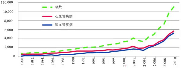 (6)慢性疾病消耗着人力和财力 慢性疾病治疗费用昂贵。慢性疾病治疗占70%的医疗保健花费。世界卫生组织预测,从2006年到2015年,中国人将为心脏疾病,中风,糖尿病花费39100亿人民币(5580亿美元)。慢性疾病高昂费用将持续增加,据中华人民共和国卫生组织计生委估计在2012年,医疗保健费共花费28910亿人民币,比2011年增加了4568.5亿人民币。尽管有大量的医疗费用,但中国人的慢性病治疗并无明显改善。未来慢性疾病将消耗更多的资源。 在美国,某些慢性治疗比其他的治疗更昂贵,一般情况下,癌症和心脏病治疗费用在逐步增加,而哮喘,糖尿病,骨关节炎的治疗费用则相对稳定。 (7)心血管疾病 两个国家最大的健康挑战之一是心脑血管疾病。据中国卫生部信息,1000万人中大约有132人死于心脑血管疾病。心血管研究卫生部防治研究中心研究表明,中国的心血管疾病发病率将迅猛增长,中国的心血管病人的数量将以0.5倍的速度增长,或者未来20年内数量将达到2130万(见图7)。心血管疾病为患者带来巨大的家庭负担。根据2010年的中国数据统计,急性心肌梗塞耗资42.87亿人民币(7.02亿美元),颅内出血耗资123.5亿人民币(20.1亿美元)脑梗塞花费227.5亿人民币(37.1亿美元)。 图7:中国心血管疾病人数(千),1980-2010