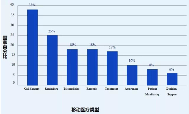 在美国,过去十年,心脏疾病治疗的成本大幅度上涨,从2000年到2010年的费用中,我们看到,心脏疾病住院患者的治疗费用从13,433美元上升至20,831美元,紧急室就诊,处方药和医院门诊治疗费用都有类似的成本上涨。 三、移动与医疗的结合发展 移动通信技术可以通过更好得接入以及医疗服务的推送来促进移动医疗的发展。移动设备为医疗承载能力的提高以及医疗服务相关补贴效率的提高提供了可能性。同时向病人和医生发送吃药提醒和诊断信息,手机为此提供了合适的途径。最终,移动医疗协议能够促进健康数据的收集和分析进而推动整个医疗体系的发展。 移动健康活动已经在世界各地普及,由世界卫生组织从事的全球调查发现多达114个国家已经积极的建立了移动医疗体系,最常见的是创建健康呼叫中心应对患者的咨询(38%),见图8,其次是设置短讯服务设置预约提醒(25%),使用远程医疗(18%),访问病人记录(18%),测量治疗状态(17%)提高健康意识(10%),监控患者(8%),医生诊疗支持(6%)。 图8. 报导的建立了移动医疗体系的国家