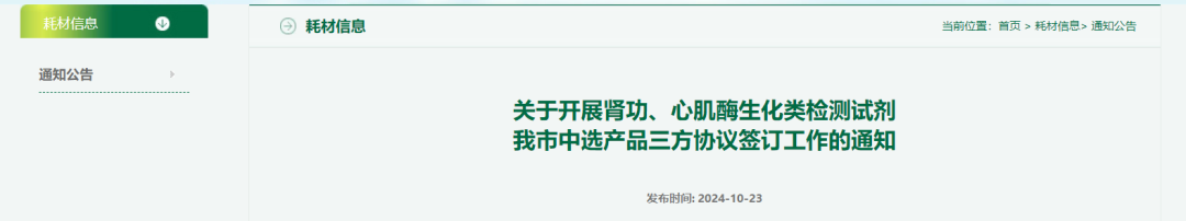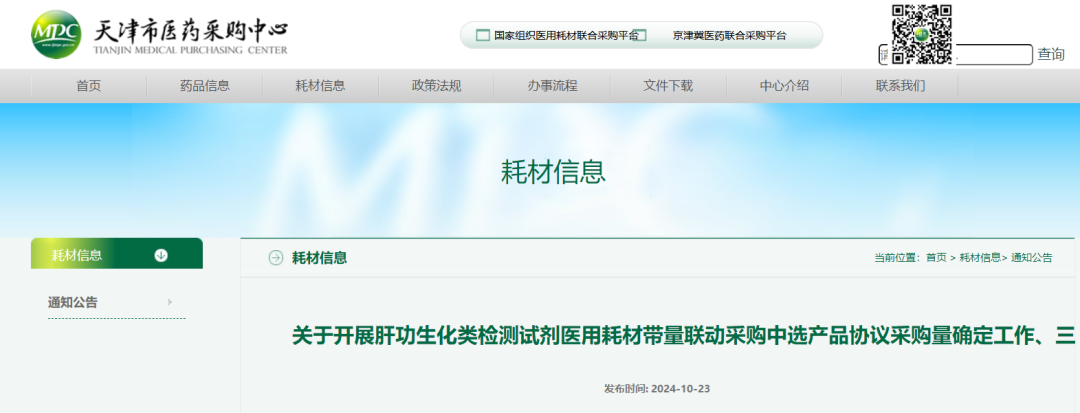 10月23日,天津市医保局发布消息,关于开展肝功生化类检测试剂医用耗材带量联动采购中选产品协议采购量确定工作、关于开展肾功、心肌酶生化类检测试剂我市中选产品三方协议签订工作的通知。 为做好京津冀“3+N”联盟肝功、肾功和心肌酶生化类检测试剂医用耗材带量联动采购工作,现京津冀平台已上线协议采购量确定、三方协议签订功能,现将相关事宜安排如下:京津冀“3+N”联盟肝功、肾功和心肌酶生化类检测试剂医用耗材带量联动采购工作中,填报需求量的医疗机构,中选企业及其自主选择的配送企业。申报企业与采购主体双向选择,确定协议采购量。对于申报企业未选择供应区域、医疗机构报量但企业未申报、谈判不成功以及拒绝供应的产品,对应采购需求量作为待分配量,由采购主体重新分配给其他符合条件的申报产品,如分配给既往轮次确认供应的申报产品,原则上企业不可拒绝供应,即选择成功;如分配给既往轮次未分配采购需求量的申报产品,申报企业确认供应意向。采购主体可多轮次分配采购需求量,直至所有采购需求量完成双向选择。协议采购量确定时间:2024年10月23日—10月25日。请中选企业及中选企业自主选择的配送企业登录京津冀医药联合采购平台,按照系统内操作手册完成配送关系确认工作。确认配送关系时间:2024年10月23日—10月30日。请各采购主体登录京津冀医药联合采购平台,按照系统内操作手册完成协议签订工作。医疗机构需使用账号登录;中选企业需使用数字证书登录;配送企业需使用账号登录。配送企业如需新领账号,请按照天津市医药采购中心网首页“办事流程-企业事项”要求,准备相关材料,发送至天津市医药采购中心邮箱,邮件标题请标明“京津冀‘3+N’项目天津市配送企业申请账号”。签订三方协议时间:2024年10月28日—11月8日。请各相关单位按时完成中选产品三方协议签订,确保京津冀“3+N”联盟肝功、肾功和心肌酶生化类检测试剂医用耗材带量联动中选结果平稳落地。线上视频培训时间:2024年10月23日(星期四)下午16:00https://meeting.tencent.com/l/Zb6kgkGREbi1为确保后续网上采购工作的顺利进行,请相关单位在规定时间完成相应工作,积极组织货源,提前储备中选产品,及时足量稳定供应。办公地址:天津陈塘科技商务区服务中心四楼(天津市河西区洞庭路20号)联系电话:022-24538155 022-24538159服务时间:9:00-12:00,13:30-16:30,节假日除外。