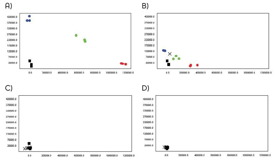 分别使用 A) Lyo-Ready™ 可冻干基因分型尿液直扩qPCR预混液 (MDX158), B/ KAPA Probe Force qPCR Mix (Roche), C) TaqPath™ ProAmp™ Multiplex Master Mix (ThermoFisher) 和 D) Type-it Fast SNP Probe PCR Kits (Qiagen) 对40% UTM样本中的人乳头瘤病毒(HPV)16型 E6-T350G突变进行检测。等位基因G(蓝色)和 等位基因T(红色)的纯合样本,等位基因G/T的杂合样本(绿色),与NTC(黑色)进行比对,图中x表示未确定。