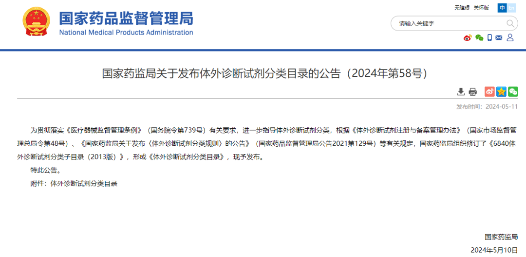 2024年5月11日,国家药品监督管理局发布了新版《体外诊断试剂分类目录》,共计1852项产品,其中三类体外诊断试剂331项,二类体外诊断试剂683项,一类体外诊断试剂838项。