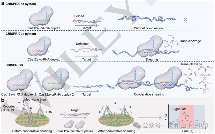 CRISPR Cas12a的高准确性分子识别能力及反式切割活性奠定了其在生物传感领域的地位,为精确诊断疾病带来了新的机遇,已出现了多种应用不同类型的Cas蛋白、报告分子、读出技术的基于CRISPR/Cas的核酸检测平台。但由于核酸的聚阴离子性质,其结构受到静电力的强烈影响;且核酸的单体结构单元之间的强相互作用使其难以形成特定序列的特定结构。因此,长靶标序列在溶液中的结构倾向于堆叠,并且大部分的结合位点被覆盖。在传统的CRISPR/Cas电化学检测中,可利用的结合位点数量有限,使得检测限难以达到fM级别,需要较长的孵育时间和预处理过程,进一步提高检测性能难度较大。故而,亟需一种能够克服现有CRISPR/Cas系统的局限性的方法。基于此,复旦大学的刘云圻院士团队构建了一个CRISPR/Cas协同剪切系统(CRIPSR-CS)。该系统中两个CRISPR/Cas-crRNA复合体存在两个识别位点,克服了低结合效率,并偶联电化学检测实现在无扩增条件下灵敏检测痕量病原体。相关成果以“An Efficient CRISPR/Cas Cooperative Shearing Platform for Clinical Diagnostics Applications”为题发表在Angewandte Chemie International Edition(DOI:10.1002/anie.202411705)。1. CRISPR-CS的工作原理 CRISPR-CS系统利用两个不同的crRNA,使得Cas12a-crRNA复合体能够有效结合靶DNA上的两个不同位点,形成独立的三核螺旋复合物以激活Cas12a的酶切活性(图1a)。在传统的CRISPR系统中,若靶向位点被覆盖,Cas12a-crRNA复合体将无法与靶标结合,而CRISPR-CS系统拥有另一个可用的靶向位点,Cas12a-crRNA复合体仍具有很高的识别概率,将显著提高Cas12a与靶标DNA的结合、捕获效率及剪切效率。工作电极的表面覆盖有石墨烯膜,修饰有亚甲基蓝基团(MB)的DNA四面体纳米结构(TDN-MB)通过1-芘丁酸琥珀酰亚胺酯(PASE)与石墨烯膜偶联。当施加负电位时,由于DNA骨架带负电,TDN-MB在溶液中保持直立,悬臂末端的MB远离电极。而当靶标存在时,两个Cas12a-crRNA复合物结合靶DNA上的两个位点,Cas12a被激活,切割TDN-MB上的单链悬臂,将MB分子推离电极,导至最初的高电信号显著降低(图1b)。
