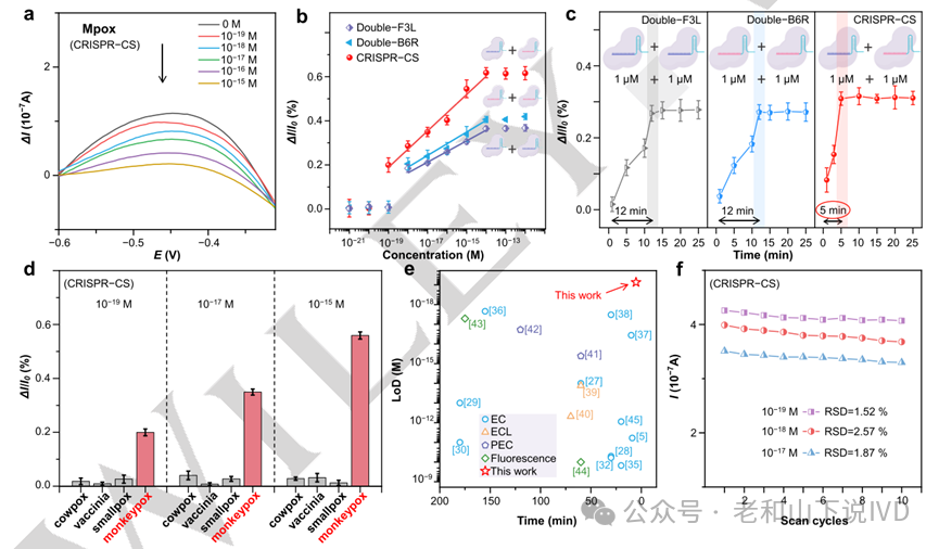 图1 CRISPR-CS的工作原理 2. CRISPR-CS系统协同剪切性能验证 为了检验CRISPR-CS系统的可行性,研究团队选择了人畜共患病原体—猴痘病毒(Mpox)作为靶标。他们分别设计了两个crRNA以靶向Mpox病毒的B6R位点和F3L位点,并采用差示脉冲伏安法(DPV)对信号进行了分析。随着靶标浓度从10−19 M增加到10−15 M,峰值电流逐渐减小(图2a)。当靶标浓度大于10−14M时,电流响应趋于稳定,响应值约占初始电信号的0.62%(图2b),计算得出LoD为9.5´10−20M。研究团队同时设计了仅靶向B6R位点或F3L位点、Cas12a-crRNA复合体添加量为双倍的Double-F3L、Double-B6R作为对照组,CRISPR-CS系统具有更宽的检测范围及更显著的信号变化(图2b)。等离子体共振实验(SPR)结果表明CRISPR-CS系统的平衡解离常数比另外两组低一个数量级,证明其确实具有更强的结合亲和力。研究团队还测试了CRISPR-CS及对照组在添加浓度为10−17 M的靶标后不同时间的ΔI/I0响应(图2c)。CRISPR-CS系统在5 min内产生显著的电流响应,而Double-F3L和Double-B6R实现类似的响应大约需要12 min。故CRISPR-CS系统的协同剪切效应不仅提高了检测灵敏度,还加快了反应速度。且CRISPR-CS在Mpox核酸检测中表现出良好的特异性(图2d)及重复性(图2f)。与现有其他方法相比,CRISPR-CS系统在检测时间和LoD方面表现优异(图2e)。