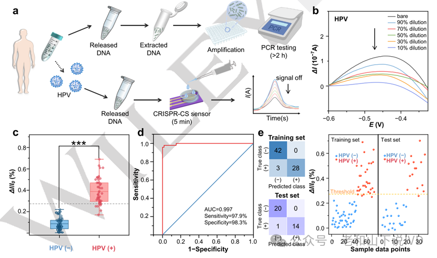 图3 CRISPR-CS的性能测试 4. 临床样本测试 CRISPR-CS系统通过无扩增检测大大缩短测试步骤和时间(图4a)。研究团队检测了36例HPV临床标本,其中16例为阳性(P1~P16),20例为阴性(N1~N20),CRISPR-CS的灵敏度为97.9%,特异性为98.3%(图4c、4d)。当检测梯度稀释后的阳性样本P5时,信号变化随着样品稀释倍数的增加而减小(图4b),上述结果表明CRISPR-CS平台可用于疾病靶序列的准确核酸检测。为了构建更有效的广义疾病检测平台模型,研究团队选择了支持向量机(SVM)为机器学习算法,通过线性核函数进行训练后,准确率达97.14%,能够有效区分阴性和阳性样品(图4e)。
