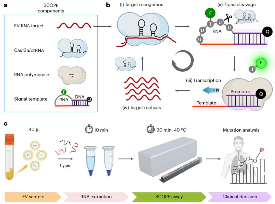 今天我们了解一个检测灵敏度低的mRNA检测技术SCOPE,该技术同时采用基于Cas13a旁切信号放大和T7转录的2种信号放大方法的联合策略,显著提高了检测灵敏度。 SCOPE技术的具体原理如图1所示,首先就是先利用集合靶标RNA序列后的Cas13a的旁切活性来释放和放大荧光信号,其次就是旁切后的T7转录活性被释放从而转录产生更多的靶标RNA片段,从而开始进一步放大信号,实现荧光信号强度的二次放大,而且整个过程也只需要不到1个小时,真的是又快又准。 图1引自[1] 和之前仅仅基于Cas13a的旁切活性放大信号的单一方式相比,SCOPE技术的旁切加转录来二次放大荧光信号的检测灵敏度更高,信号强度也更大(图2)。 图2引自[1] SCOPE的二级信号放大策略非常优秀,另外采用High FIdelity的Cas13a突变体也可以帮助有效的实现点突变级别的RNA检测,帮助降低假阳性,是一种非常好的RNA检测技术。 参考文献: 1. Song, J., Cho, M.H., Cho, H., Song, Y., Lee, S.W., Nam, H.C., Yoon, T.H., Shin, J.C., Hong, J.S., Kim, Y. and Ekanayake, E., 2024. Amplifying mutational profiling of extracellular vesicle mRNA with SCOPE. Nature Biotechnology, pp.1-11. |