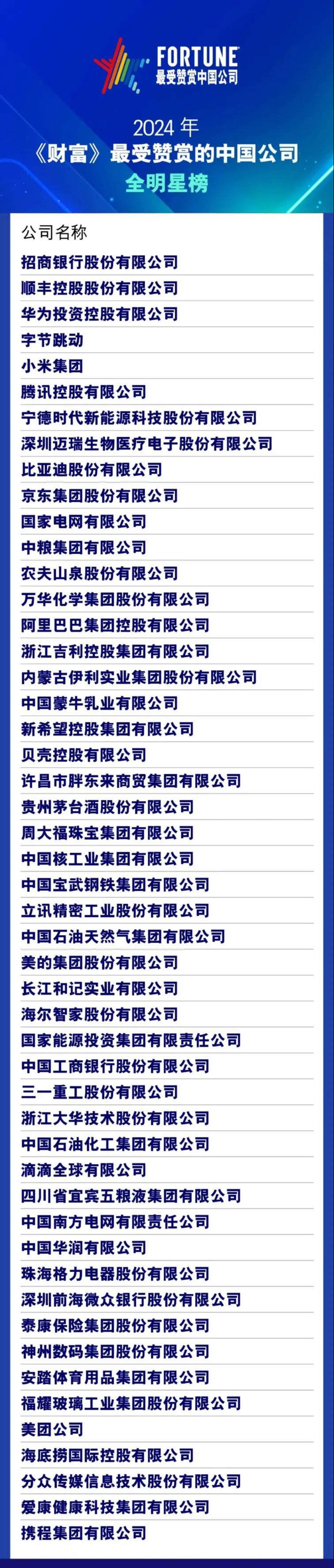 《财富》最受赞赏的中国公司榜单体现了中国企业群体的“软实力”。“软实力”包括但不限于管理、人才吸引力、产品或服务、社会责任、投资价值、资产和全球化等方面的能力。 深圳迈瑞生物医疗电子股份有限公司上榜。 《财富》最受赞赏的中国公司榜单是对企业软实力的考量。参与榜单申报而进入候选池的332家公司既有《财富》世界500强和中国500强,也有“镁光灯下”的明星公司。 《财富》(中文版)通过网络向40,111名中国企业管理人发放了问卷。问卷分两部分,第一部分是依据受访者所在行业,请受访者从管理能力、人才吸引力、产品/服务能力、社会责任、投资价值、资产和全球化等几个角度,对同行业候选公司进行打分,与编辑部评分加权计算后,行业综合得分领先的公司进入行业明星榜。第二部分是受访者在所有的侯选公司中不分行业选出心目中最受推崇的公司,与编辑部评分加权计算后,综合得分最高的50家公司荣登“《财富》最受赞赏的中国公司”全明星榜。在任何情况下,接受调查者都不得选择自己所在的公司。 完整榜单 |