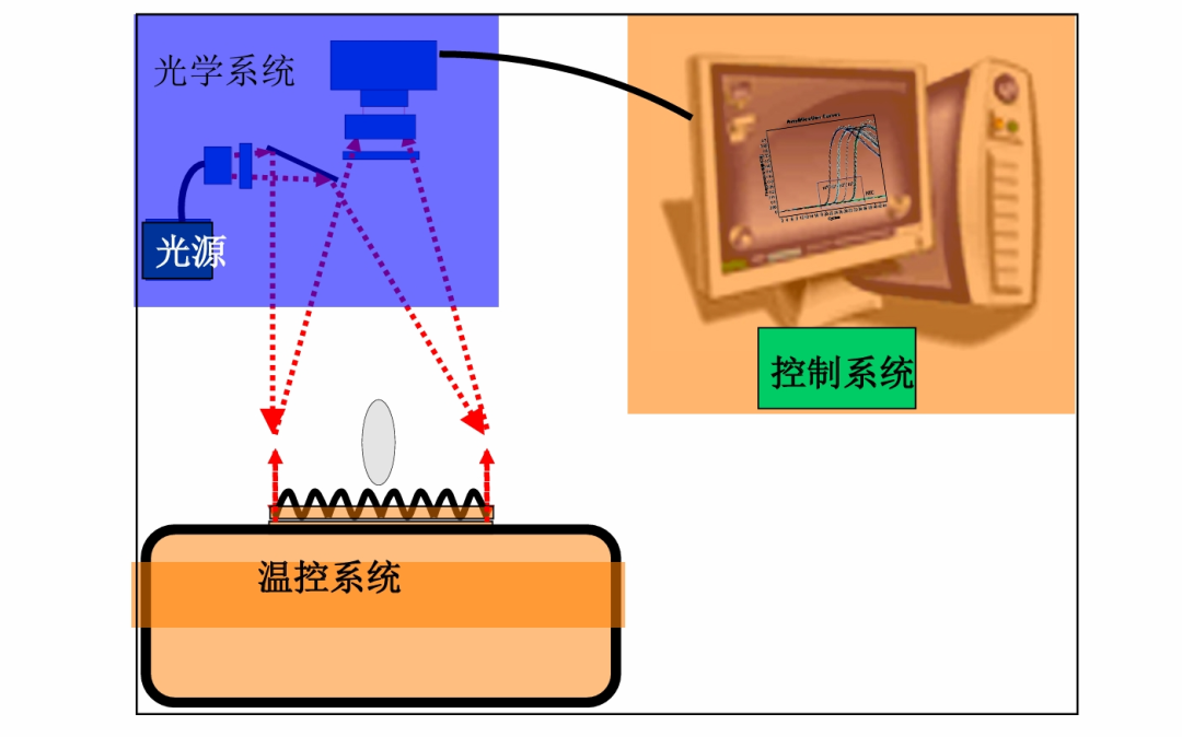 其PCR扩增原理和普通PCR仪扩增原理相同,只是PCR扩增时加入的引物是利用同位素、荧光素等进行标记,使用引物和荧光探针同时与模板特异性结合扩增。