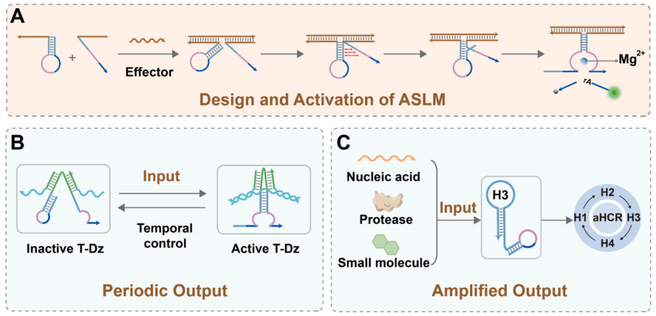 更重要的是,ASLM结构可以直接整合到DNA催化电路中,用于检测多种生物分子,包括核酸、蛋白酶和小分子。这种设计不仅可提高检测的灵敏度和准确性,而且可以大大扩展DNA纳米技术的应用范围。
