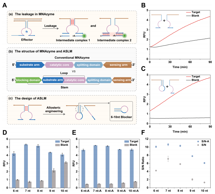 为了克服这一挑战,重庆医科大学检验医学院谢国明教授团队提出了一种创新的解决方案——变构茎环MNAzyme(ASLM)。这种设计通过引入一个阻断域,有效减轻了由于单链功能区瞬时杂交引起的背景信号,同时在复合物形成过程中稳定了结合亲和力,该方案不仅解决了MNAzyme信号泄漏的问题,而且为DNA纳米技术的发展开辟了新的道路