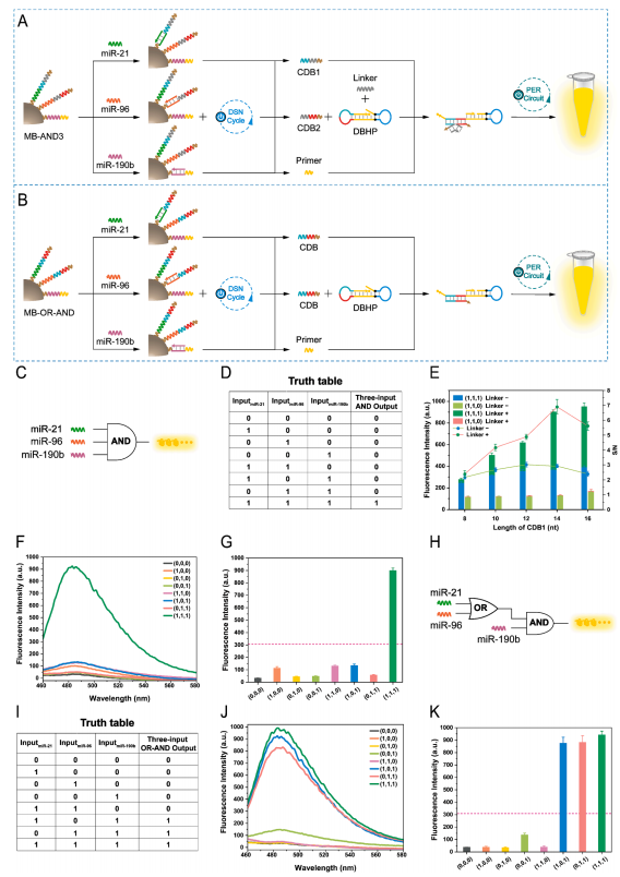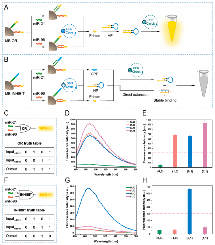 AND逻辑门:通过miR-21和miR-96与特定CPs的相互作用,DSN切割产生的条形码序列与DBHP互补,激活PER扩增电路。仅当miR-21和miR-96同时存在时,输出为1,符合AND逻辑关系。