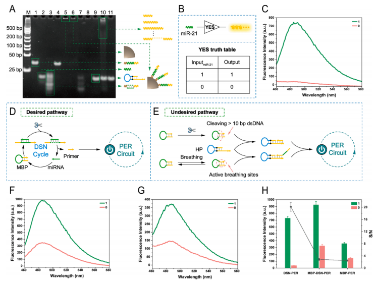 21(miR-21)作为目标分子。通过PAGE分析来评估DSN介导的切割反应和通过PER扩增合成G4串联体的可行性。实验结果表明,DSN能选择性地消化DNA/RNA异源双链体,释放miRNA和条形码序列。在目标miR-21存在时,产生显著的荧光信号,成功实现了YES逻辑门。此外,通过优化分子信标探针的茎长度,提升了两种额外系统(MBP-DSN-PER和MBP-PER)分析性能和信噪比。结果证明DSN-PER系统在背景信号和信噪比方面优于MBP系统,适用于miRNA分析和逻辑门构建。