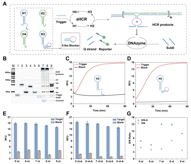 ASLM的变构设计可以在不牺牲DNA放大电路的兼容性的同时,最小化背景信号,从而提高传感检测的灵敏度。通过在HCR发夹(H1和H3)内设计MNAzyme亚基,并在H3的5'端引入阻断结构域,可以在没有目标分子的情况下抑制非特异性结合。并通过PAGE分析,展示了aHCR系统的高效率运行。