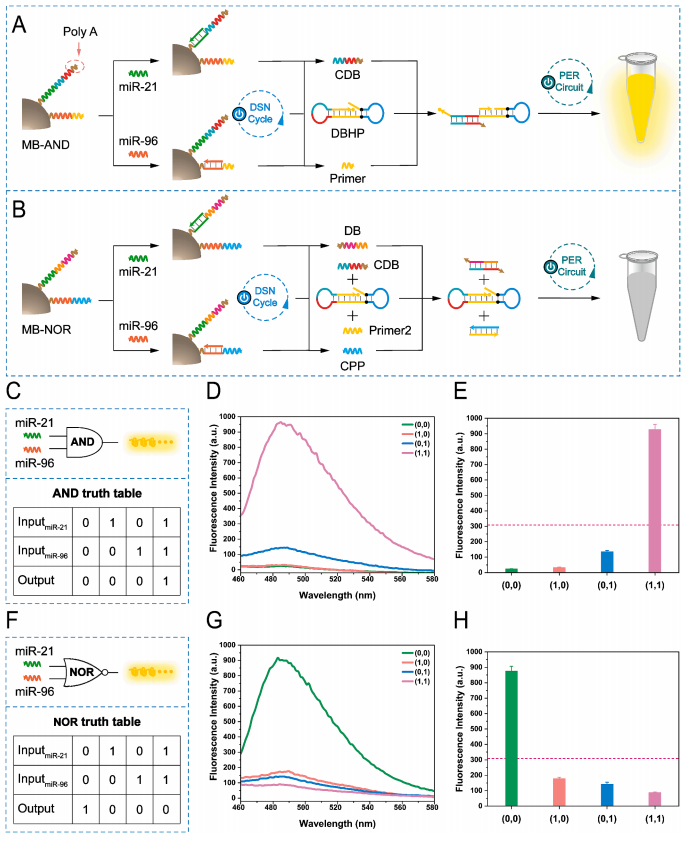 对于该问题,重庆医科大学检验医学院谢国明教授团队的另一项新的研究提出了一种不受序列限制的策略,通过DSN辅助循环和PER扩增电路(DSN-PER),实现多功能分子逻辑电路的构建