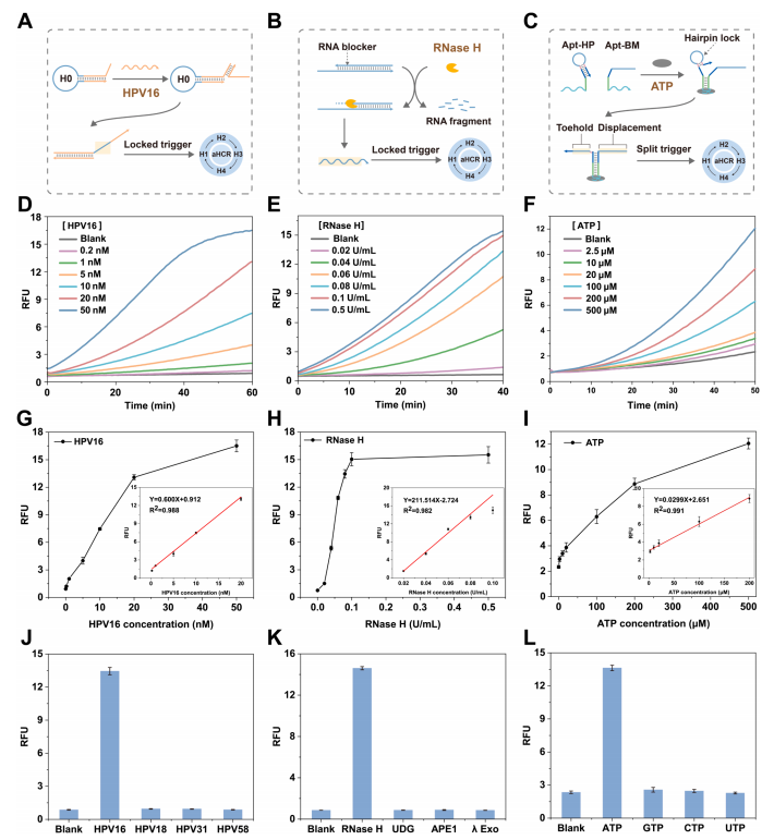 在证明了aHCR令人满意的扩增效率后,该研究继续探索使用当前系统开发多功能生物传感,以响应不同类型的生物标志物。其核心技术是利用改良的发夹环扩增反应aHCR以及自由设计的触发序列,作为通用激活剂,赋予了aHCR对多种生物标志物的响应能力。