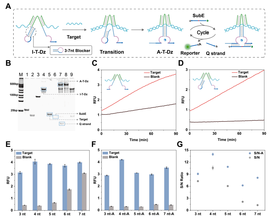 同时,该研究比较了不同茎环设计的反应结果,这些设计具有不同长度的阻断域。对于传统MNAzyme,催化效率受到分裂域长度的影响。在一定范围内,延长分裂域可能导至形成更稳定的催化核心组装,从而提高MNAzyme的反应效率。然而,当分裂域超过7个核苷酸时,由于MNAzyme的二级结构,切割效率可能不会有效提高,并且有增加信号泄漏的风险。