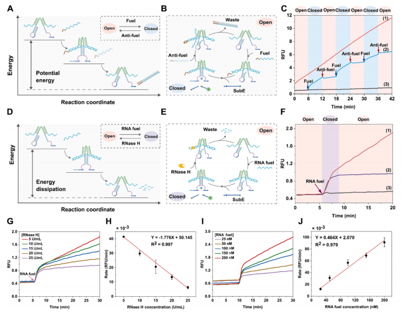 其次,ASLM驱动的信号输出也可实现基于钳形DNA酶的耗散版本。纳米镊子的构象转换响应动力学控制,产生自发的开合循环,且信号变化的时间间隔由核酸消耗单元作用下的燃料消耗速率决定。此外,不同浓度的核酸酶和燃料在耗散系统中的反应动力学存在差异,且信号输出速率与浓度呈线性相关。