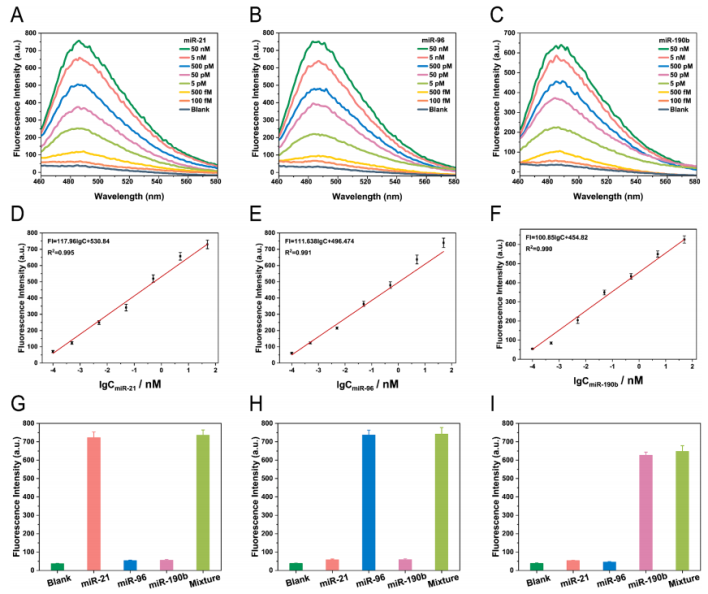 随后,该研究进一步优化了DSN-PER系统在miRNA检测中的性能,确定了包括CP与MBs的孵育时间和温度、DSN和Bst的用量、DSN辅助目标循环的孵育时间和HP的浓度,等关键实验参数。并在最佳条件下,成功检测了与乳腺癌相关的miR-21、miR-96和miR-190b。结果显示,随着miRNA浓度的增加,荧光强度逐渐增加,并在100fM到50nM范围内呈现线性关系。