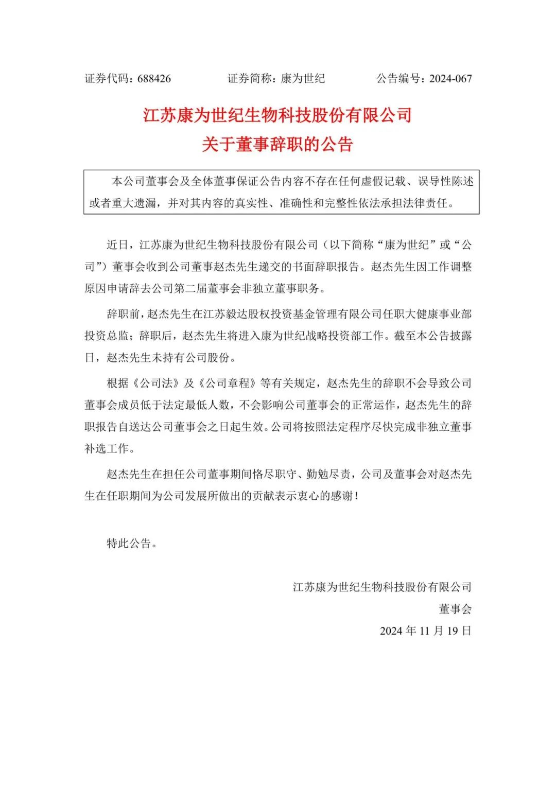 11月18日晚间,康为世纪发布公告称,公司董事会收到公司董事赵杰先生递交的书面辞职报告。赵杰先生因工作调整原因申请辞去公司第二届董事会非独立董事职务。 辞职前,赵杰先生在江苏毅达股权投资基金管理有限公司任职大健康事业部投资总监;辞职后,赵杰先生将进入康为世纪战略投资部工作。截至本公告披露日,赵杰先生未持有公司股份。 江苏康为世纪生物科技股份有限公司是一家立足于生命科学领域,有自主知识产权的国家高新技术企业,主要从事高附加值、高技术含量的生物试剂的研发与生产,为生命科学研究、基因检测和体外诊断用户提供创新型生物产品和服务。公司建立了专业化、集约化、能够形成自主知识产权的技术创新体系和开放式的合作创新平台,构建成了公司完整的研发创新体系。产品线主要包括分子诊断原料酶、核酸采集与保护剂、核酸提取试剂盒、分子诊断检测试剂等,打破了中国生物研究与产业对进口试剂的依赖。 |