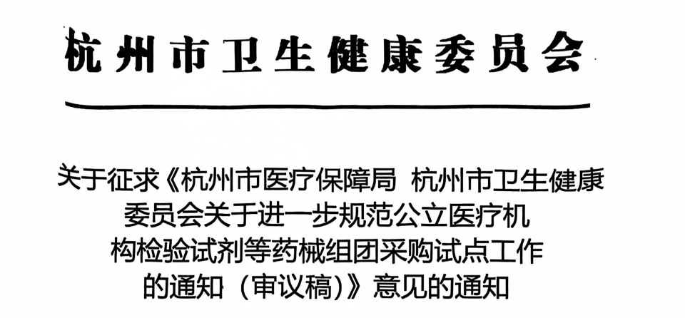 今日,杭州市医保局及杭州市卫健委联合发文,关于征求《杭州市医疗保障局杭州市卫生健康委员会关于进一步规范公立医疗机构检验试剂等药械组团采购试点工作的通知(审议稿)》意见的通知。