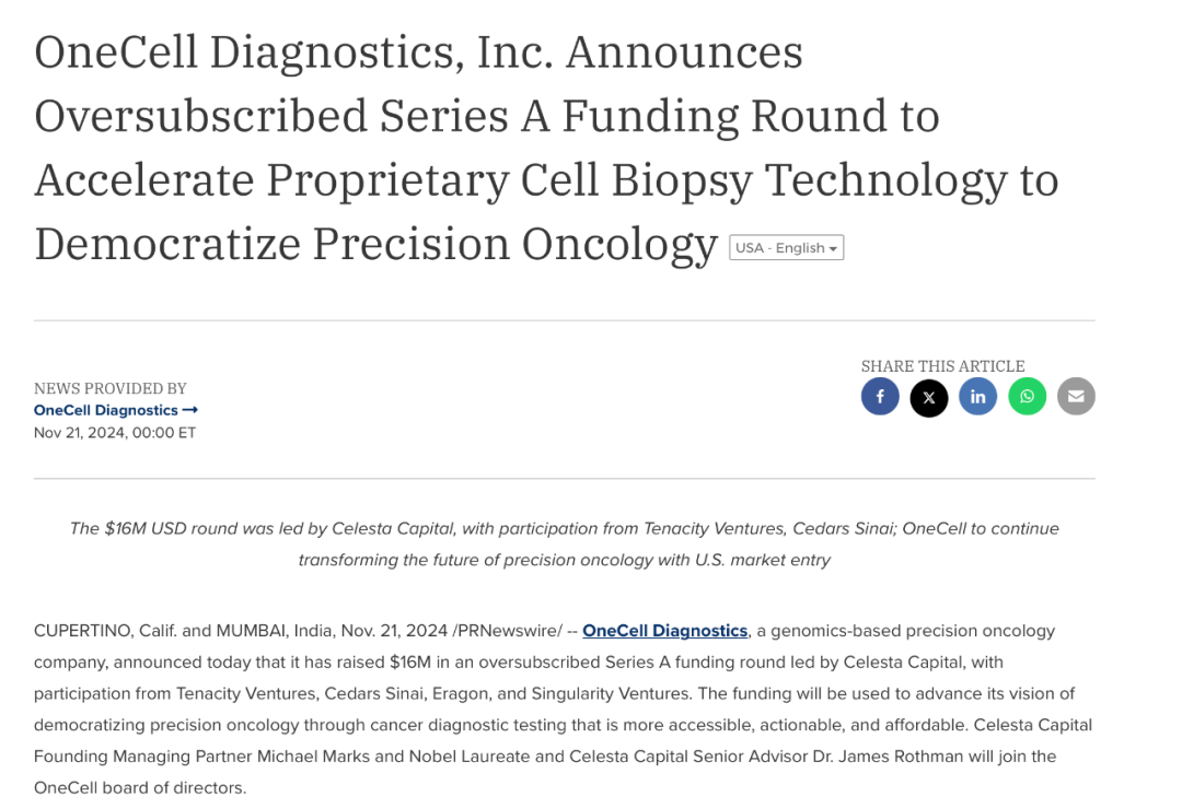 该基金将用于推进精准肿瘤学的民主化愿景,通过更容易获得、可操作和负担得起的肿瘤诊断检测。Celesta Capital创始管理合伙人迈克尔·马克斯(Michael Marks)和诺贝尔奖得主、Celesta Capital高级顾问詹姆斯·罗斯曼(James Rothman)博士将加入OneCell董事会。 单细胞诊断:通过基因组创新彻底改变肿瘤学 OneCell Diagnostics是一家领先的精准肿瘤学公司,专注于基于基因组学的解决方案,以增强癌症管理。其专有平台将下一代测序与先进的生物信息学人工智能(AI)、机器学习(ML)和多组学生物标志物分析相结合,以提供尖端的癌症诊断。 液体活检技术:0neCell的突破性True-Single-Cell-Multi-omics平台推动其精准肿瘤诊断。该技术将循环肿瘤细胞(CTC)DNA、CTCRNA和细胞表面蛋白测试整合到一个血液样本中,相对于传统的液体活检方法是一个重大进步。 应用包括:癌症筛查、监测治疗反应、检测疾病进展和复发。 旗舰产品:通过A轮融资,OneCell正在美国市场上推出其下一代液体活检测试,0ncolndxlkon。该测试检测和分析CTCS,提供可操作的生物标志物,以增强癌症患者的诊断和治疗策略。 全球影响和范围:0neCel在硅谷和印度运营,已经在印度测试了近10.000名患者展示了其在临床和实验室环境中的技术可扩展性、安全性和成本效益。 合作和伙伴关系:与哈佛大学医学院和斯坦福大学等领先机构建立的战略合作伙伴关系,推动了OneCell的技术进步和临床应用。 应对全球挑战:根据世界卫生组织的数据,每年有2000万新患者患有癌症,其中5350万人在诊断后的五年内存活。 由于癌症是由持续的分子水平变化驱动的,生物标志物检测至关重要。目前,全球超过一半的肿瘤学临床试验都整合了生物标志物检测,以优化治疗决策并在治疗过程中监测疾病反应。 通过利用先进的基因组学和多组学技术,OneCellDiagnostics正在改变全球癌症诊断和精准肿瘤学的格局。 “我们希望未来每个人都能获得高质量的、拯救生命的癌症检测,这笔资金有力地证明了我们的愿景”,OneCell Diagnostics的首席执行官兼联合创始人莫汉·乌塔瓦尔(MohanUttarwar)表示,“通过将我们的单细胞多组学分析与下一代液体活检方法相结合,我们有机会在全球范围内提供准确、个性化的癌症护理,开辟新的领域。” |