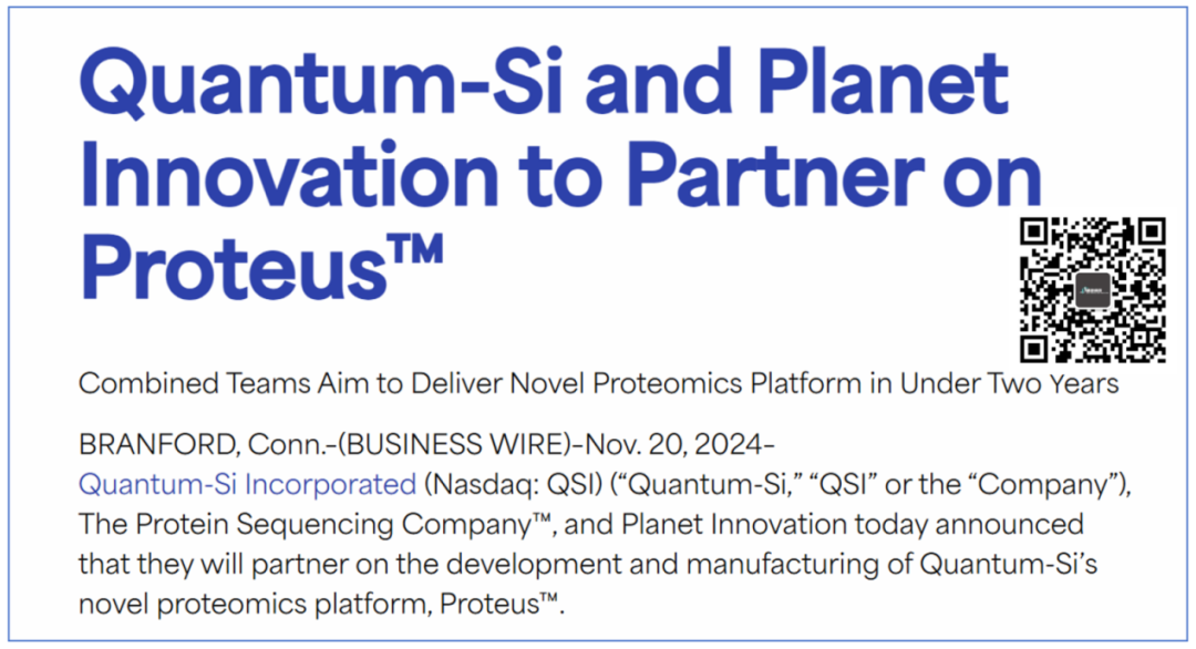 2024年11月20日当天,Quantum-Si还宣布了一项与Planet Innovation的合作。