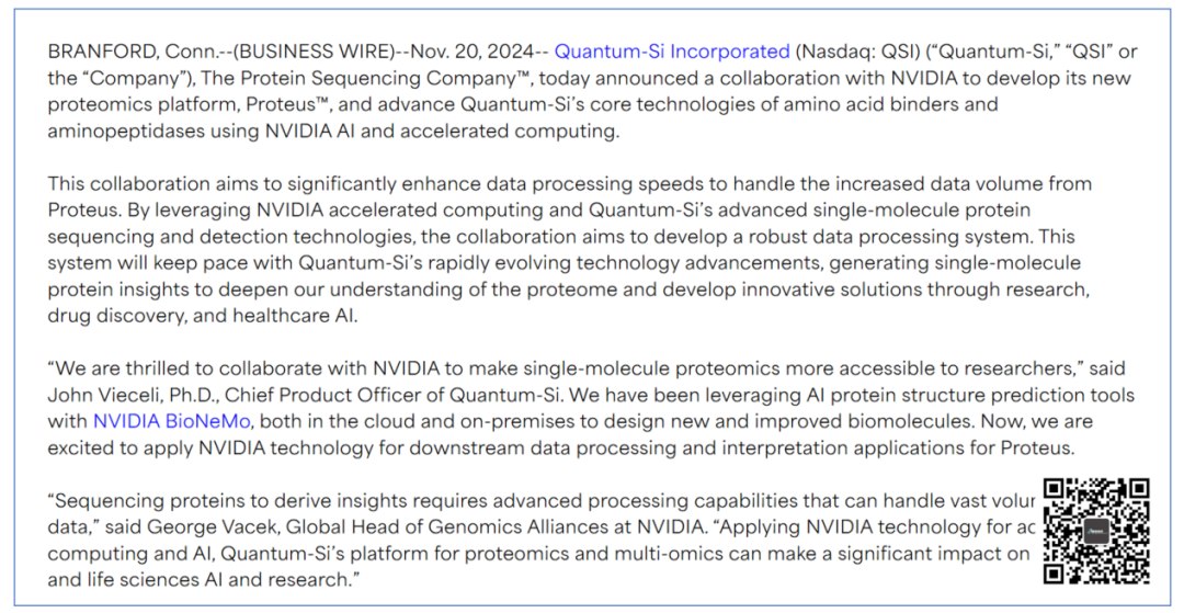 去掉废话部分,这个合作基本上是Quantum-Si与Nvidia达成合作,将利用Nvidia的A.I.技术加速QSI新的蛋白测序平台Proteus的开发(记住Proteus这个名字,要考)。