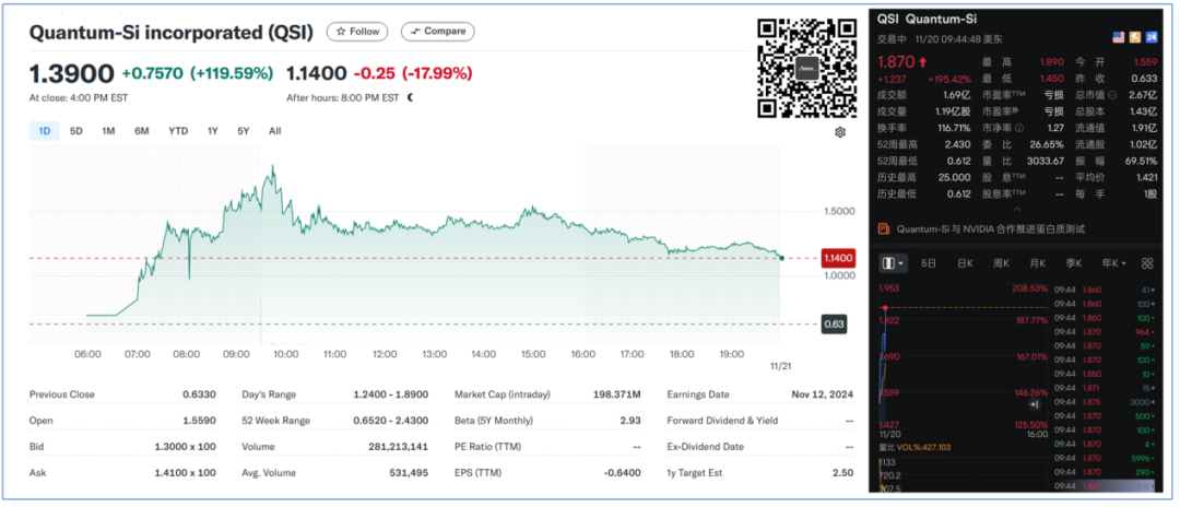Quantum-Si的股价涨幅甚至一度达到约+200%,这货一共市值2个多亿,最后成交额硬生生给干到了4个亿。