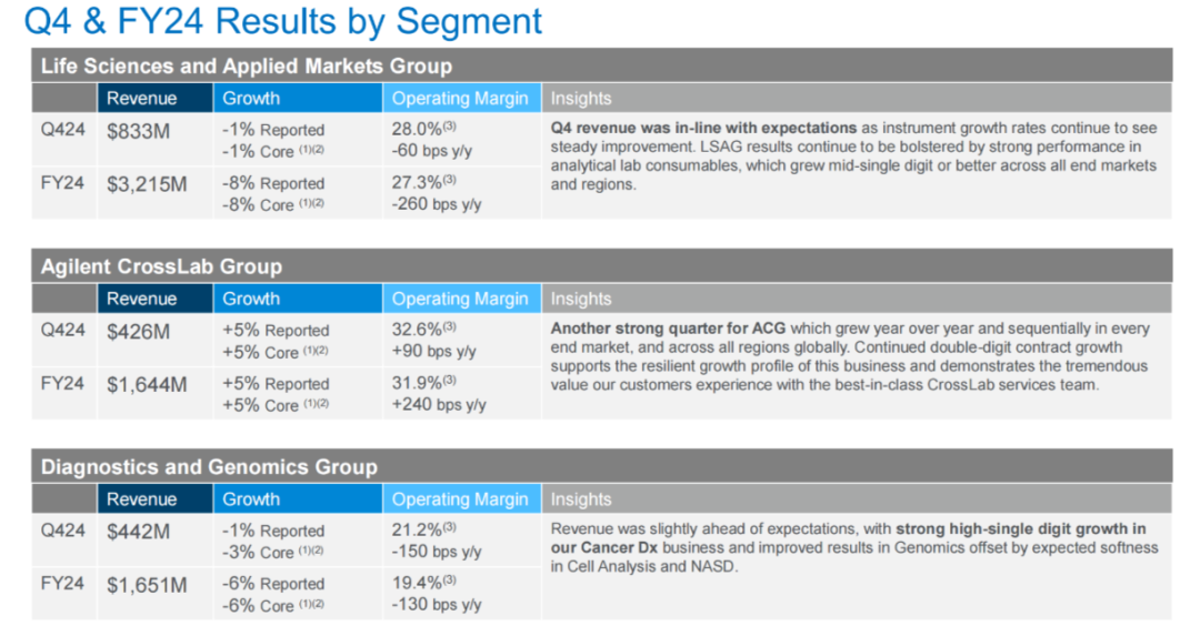 近日,安捷伦科技宣布了其商业模式调整的核心战略,这将包括业务整合和确立新的业务焦点。在这一系列举措的同时,安捷伦在周一发布的另一份公告中透露,截至上一财年11月的12个月期间,其营收遭遇下滑,与去年同期相比减少了4.7%,降至65.1亿美元。根据AlphaSense金融信息平台提供的电话会议记录,首席财务官Robert McMahon在周一的财报电话会议上指出,与制造业其他企业一样,安捷伦在2024年也受到了中国市场的不利影响。截至2024财年,安捷伦科技旗下设有三个业务部门:生命科学与应用市场业务、安捷伦跨实验室业务以及诊断与基因组学业务。通过此次立即生效的业务调整战略,安捷伦将重组为三个新的业务部门。第一个部门:将整合其合同研发生产组织(CDMO)业务和诊断工具服务业务,由原诊断与基因组学业务总裁Simon May领导。这个新成立的“生命科学与诊断市场业务”(Life sciences and Diagnostics Markets)部门预计每年将为公司贡献25亿美元的营收,占公司总营收的38%。第二个部门:将为食品、化工和环境相关行业提供光谱学及真空技术平台,由原气相色谱与质谱服务业务副总裁兼总经理Mike Zhang负责。这个被称为“应用市场业务”(Applied Markets)的部门有望为安捷伦贡献总营收的20%。第三个部门:名为“跨实验室”(CrossLab)业务,将专注于软件、自动化和耗材仪器领域。预计该部门将为安捷伦带来总营收的42%,并将继续由10个月前就担任此职务的Angelica Riemann负责。安捷伦表示,关于此次业务调整的更多细节将在12月17日的投资者日活动上公布。其2025年第一季度的业绩报告也将按照这一新架构来呈现。目前,安捷伦表示看到了盈利复苏的迹象。截至11月的三个月里,其营收达到17亿美元,与去年同期相比增长了0.8%,并且超出了华尔街预估的16.7亿美元。首席执行官Padraig McDonnell在财报电话会议上表示,这一微小增长表明“市场持续稳步复苏”,预计这一趋势将持续到明年。在过去一年中,安捷伦已经实施了一些影响运营的措施。7月,它以9.25亿美元收购了加拿大的合同研发生产组织(CDMO)生物维克特拉公司。6月,它宣布在除CDMO部门外的整个业务范围内裁员184人。cr:Agilent reveals plans to remodel operations as annual revenue dips