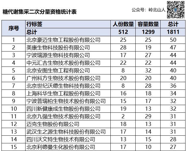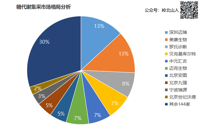 从市场占比来看,深圳迈瑞占比13%,美康生物占比12.6%,罗氏诊断占比7.6%。前10厂家占比为70%,其余144个厂家占比30%。  从需求量和中选匹配来看,至少有11个厂家,没有医疗机构报需求量,整体市场需求金额为0。出去这11个厂家,其实只有144个厂家真正中选且有市场需求量。 从分量资格来看,北京豪迈有50个产品有二次分量资格,美康生物有47个产品具有二次分量资格,宁波瑞源和中元汇吉分别有44个产品,而北京安图和广州科方分别有40个。