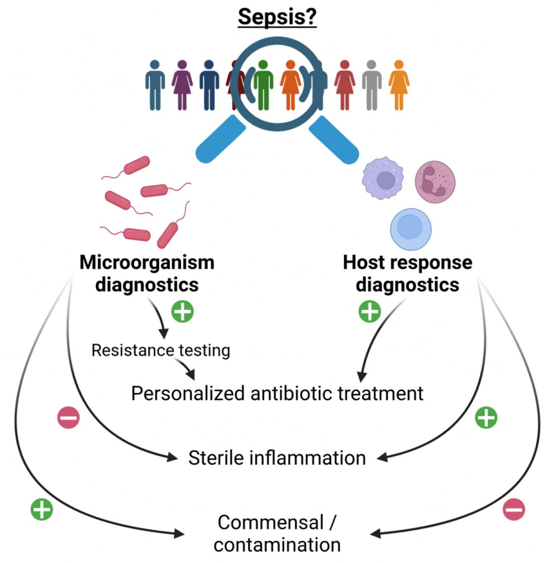 诊断脓毒症仍然是个问题。病原体的识别往往缺失,而宿主反应的失调则表现出非特异性。血液培养通常需要几天时间才能报告结果,即便如此,约90%的结果仍为阴性,尽管有强烈的脓毒症临床证据标准的宿主反应生物标志物,如C反应蛋白(CRP)降钙素原(PCT)白细胞计数,通常被使用;然而,这些标志物的区分能力不足缺乏特异性在重症监护病房(ICU)环境中,这一点尤其具有挑战性,因为许多患者存在潜在的无菌性炎症,这些情况会与脓毒症的临床和实验室特征极为相似。尽管多年来出现了多种新的脓毒症生物标志物,但至今没有一种能通过持续超越现有标准而获得广泛应用。