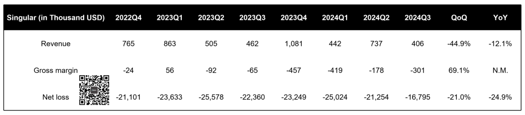 2024Q3营收40.6万美元,同比下滑12.1%,环比下滑44.9%。