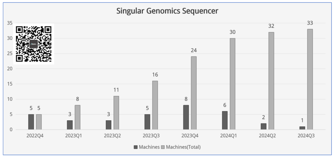 算上这一台,练习时长两年的Singular一共卖出去33台测序仪,2024前9个月只卖出9台测序仪。
