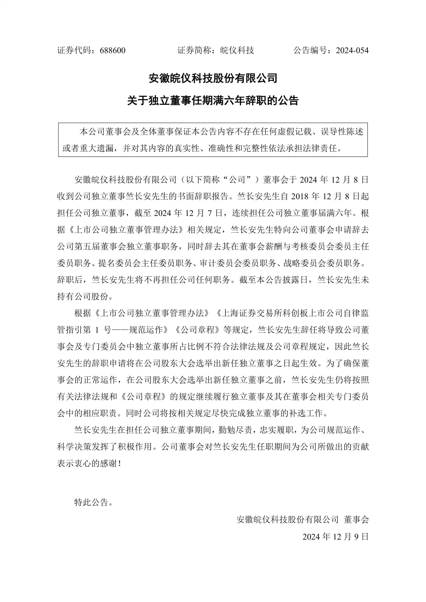 2024年12月09日,皖仪科技发布关于独立董事任期满六年辞职的公告。 安徽皖仪科技股份有限公司(以下简称“公司”)董事会于 2024 年 12 月 8 日 收到公司独立董事竺长安先生的书面辞职报告。 竺长安先生自 2018 年 12 月 8 日起 担任公司独立董事,截至 2024 年 12 月 7 日,连续担任公司独立董事届满六年。根据《上市公司独立董事管理办法》相关规定,竺长安先生特向公司董事会申请辞去公司第五届董事会独立董事职务,同时辞去其在董事会薪酬与考核委员会委员主任 委员职务、提名委员会主任委员职务、审计委员会委员职务、战略委员会委员职务。 辞职后,竺长安先生将不再担任公司任何职务。截至本公告披露日,竺长安先生未持有公司股份。 竺长安先生在担任公司独立董事期间,勤勉尽责,忠实履职,为公司规范运作、 科学决策发挥了积极作用。公司董事会对竺长安先生任职期间为公司所做出的贡献 表示衷心的感谢! 公告原文 |