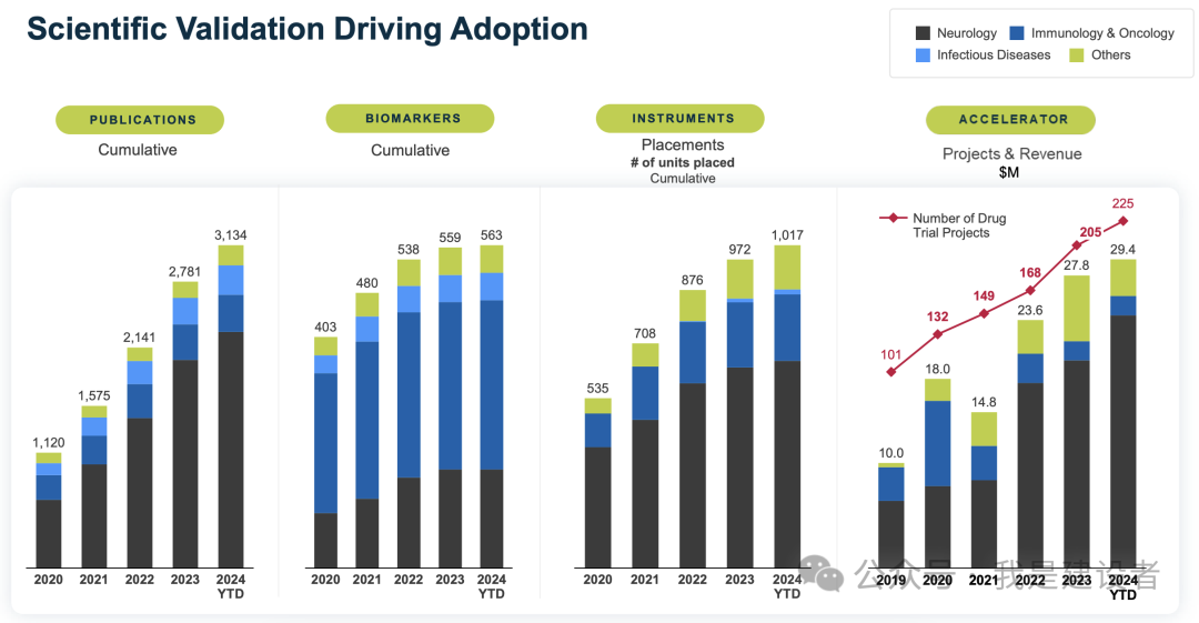 蛋白检测公司Quanterix发布公告称将以高达 7000 万美元的价格收购磁珠制造公司 Emission。 Quanterix的 Simoa数字免疫测定技术以超灵敏著称,能够实现远低于传统ELISA这种模拟方法的定量限 (LoQ),有助于血液、血清或血浆中早期低含量低生物标志物检测。 Simoa技术基于标准ELISA,但可以在顺磁珠上分离单个免疫复合物。Simoa 与传统免疫测定的主要区别在于它能够将单个分子捕获在飞升大小的孔中,从而可以对每个单独的珠子进行数字读出,以确定它是否与目标分析物结合。 Quanterix与Sony合作,在所谓的“智能盘”上制造微孔阵列。每个 Simoa 盘包含 24 个流动池,每个流动池都有 20万个阵列的微孔,每个微孔可容纳一个磁珠。 将顺磁性珠子与目标蛋白亲和的抗体结合在一起添加到生物样本中,然后添加能够产生荧光产物的检测抗体,这样可以形成磁珠-结合蛋白-检测抗体“三明治”复合物。在低浓度下,每个磁珠将包含一种结合蛋白,或者不包含任何蛋白。样品被分装入Simoa盘中的微孔阵列中。利用荧光底物进行酶信号放大、荧光成像和信号采集,可以机载的软件可以进行查看并分析结果。 Quanterix提供了可以处理这些Simoa盘的自动分析系统,旗舰机型为完全自动化的HD-X 分析仪,可以在单次运行中检测4 种生物标志物。除此之外,还有紧凑的台式系统SR-X(最多检测4重标志物)和SP-X(最多检测10重标志物)平台,两者的区别是SP-X采用了平面阵列技术,其中目标蛋白的捕获抗体是沉积在96孔板的孔底,而非使用旋转的盘和磁珠。 配合这些自动成像免疫分析平台,Quanterix也提供了即用型的试剂盒,包含了运行监测所需的所有试剂。当然,客户也可以定制自己要检测的内容。 除了仪器和耗材,Quanterix还提供加速器实验室,这是一个CLIA 认证实验室,作为一个服务及解决方案,可以为客户特别是药企等客户提供单重和多重检测,提供生物标志物在药物研发过程中的合同研究和服务。 基于Simoa技术,Quanterix的用于已经发表了3,000多种同行评审的文章。 Emission 制造了专为低重和中重分析而设计的染料封装磁珠,以及读取这些磁珠的中重仪器平台。通过此次收购,Quanterix能够控制磁珠这个核心组件,帮助扩展高多重和多组学能力。两家公司此前已经合作多年,Quanterix 称已经验证了 Emission 的珠子技术可用于其即将推出的全新 Simoa 平台。此外,收购之后Quanterix 还能够向非 Quanterix 平台提供 OEM 的磁珠。 Quanterix 将以 1000 万美元现金收购 Emission,另外 1000 万美元与某些技术里程碑挂钩,最多 5000 万美元则取决于某些性能里程碑。 耗材在Quanterix的季度营收中占比基本上在50%左右,这是最容易保持强劲增长的类别。新仪器的推出和新的检测内容的推出都能推动耗材的重复销售。因此,将耗材特别是核心的磁珠控制在内部生产,这对于推动营收和提高毛利及运营水平来说都是至关重要的。 只是没想到,来的这么晚… |